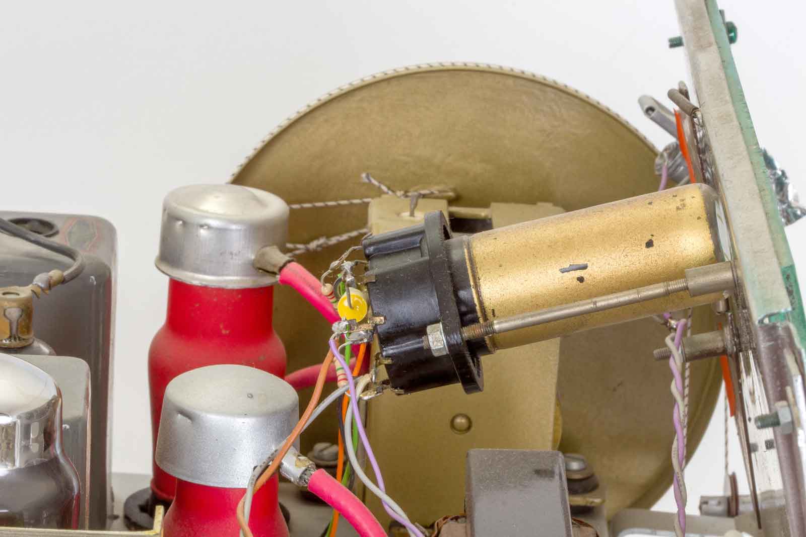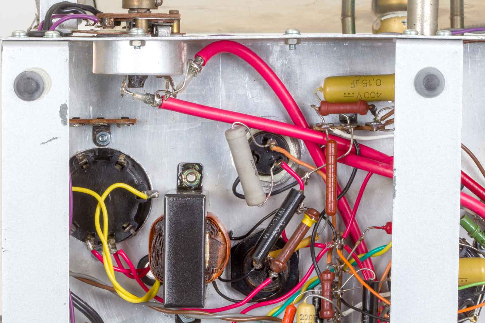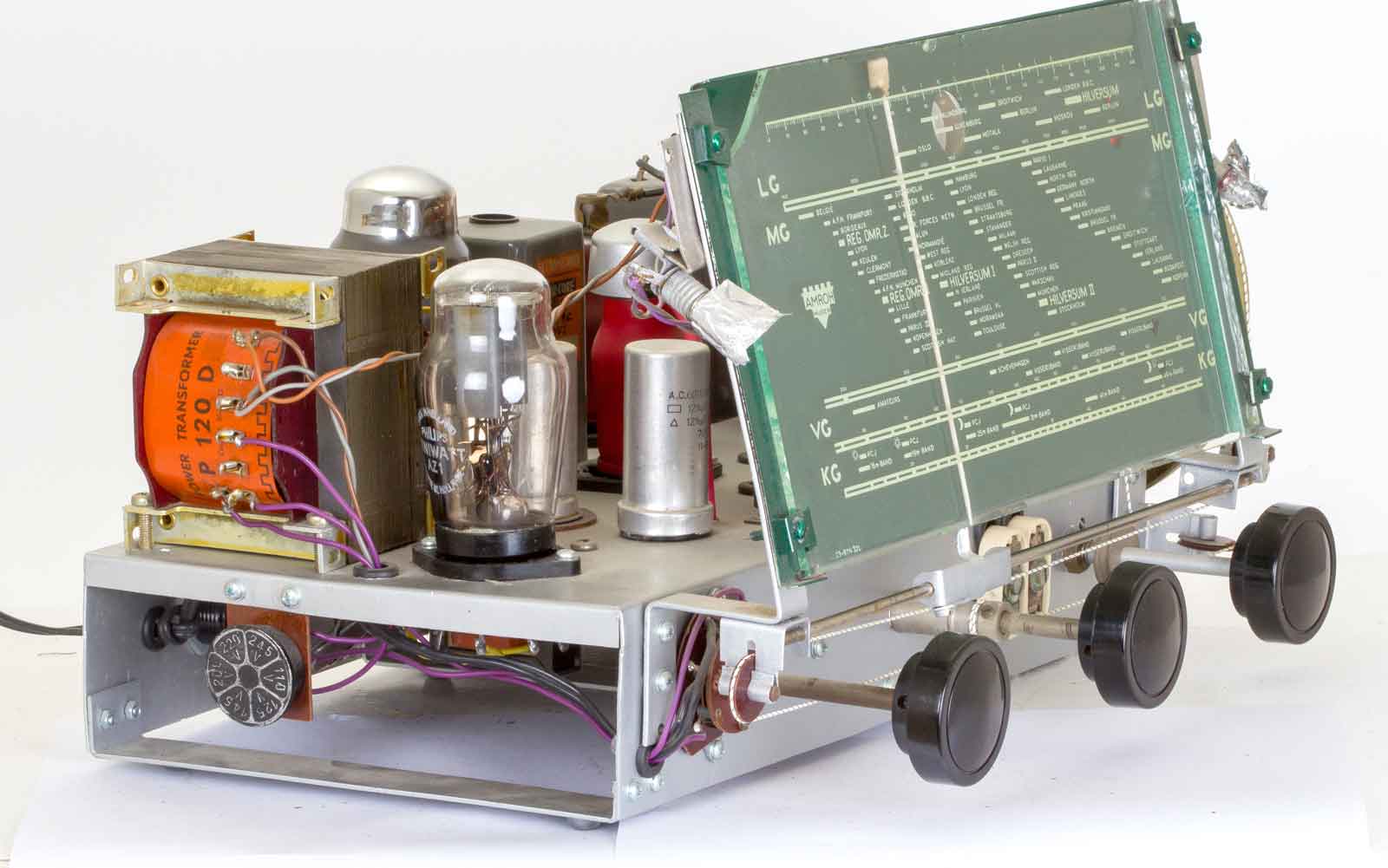 Gelukkig zijn alle slechte papiercondensatoren al vervangen door de uitstekende "mosterd"-types van Philips. De bruinige weerstanden komen ook uit Eindhoven.