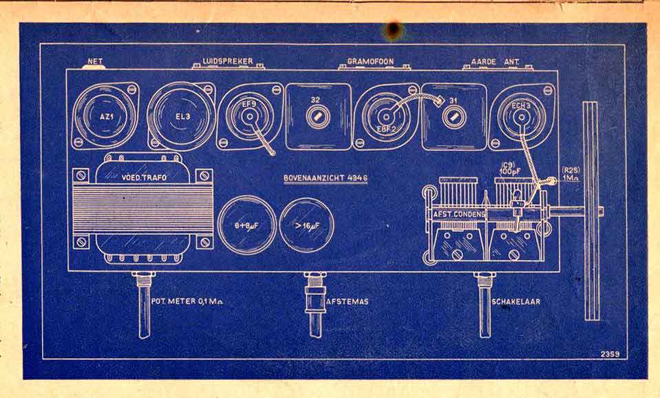 Bovenaanzicht, onder de dubbele afstem-C de mengbuis, een ECH3, daar onder de 1. MF-trafo, met rechts daarvan de MF versterker EBF2 met de detector-diodes. Boven de tweede MF-trafo (midden) een EF9 die als LF-versterker ingezet is. En daar boven de EM4. Rechts naast de 2. MF, de EL3N met daar naast de trafo met daar boven de AZ1.
