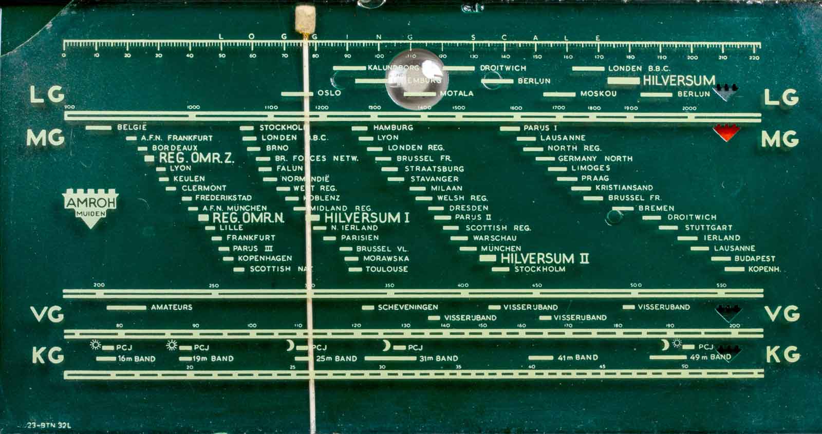 De schaal met daarop HILVERSUM I en II. Verder zijn de regionale omroepen Zuid en Noord duidelijk op de schaal geprint. De stationsbenamingen zijn voornamelijk plaatsnamen en niet de fantasielose benamingen Radio 1 of BBC. Bij de gebruikte namen zag je de steden zo voor je en je waande je bij het beluisteren ervan dat je er ook aanwezig was.