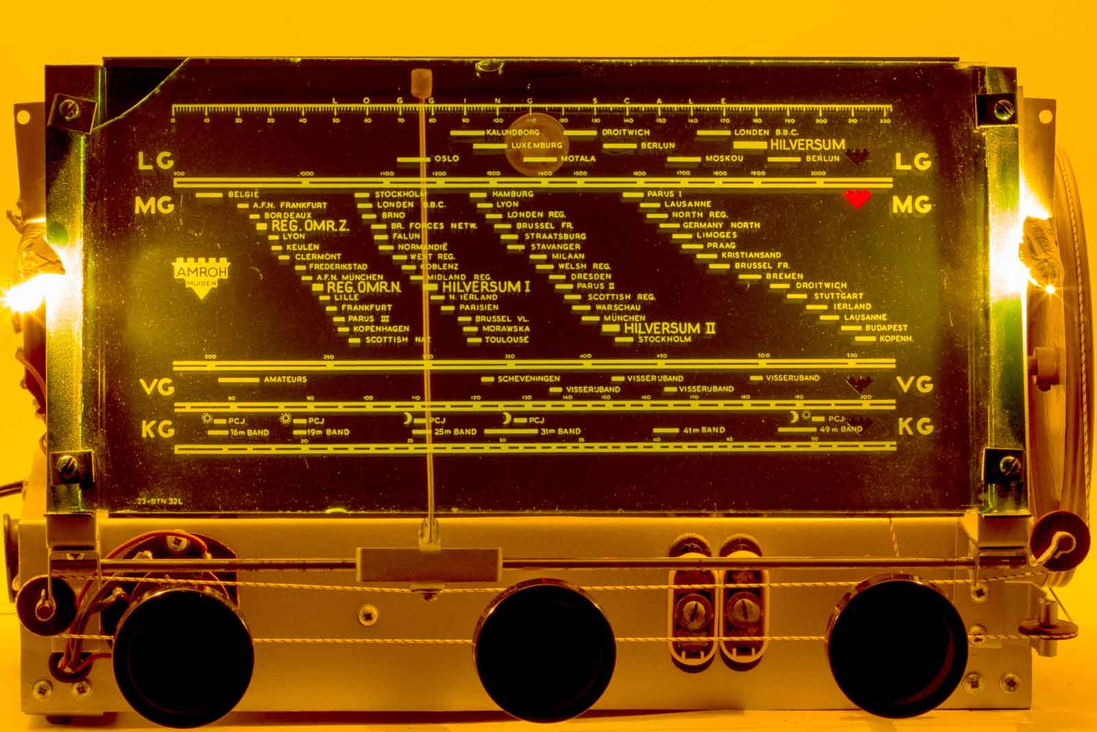 Met ingeschakelde verlichting, de twee lampjes aan de zijkant zijn voorzien van zilverpapier om er voor te zorgen dat je niet verblind wordt. Wanneer het toestel in een kast zit zie je ze echter toch niet. maar ja, die kast. Verder is de bereiksindicatie ook verlicht, achter het felrode Amroh-venstertje is ook een lampje aanwezig, een tweede zelfs voor VG en KG. Nu staat het toestel dus op de MG afgestemd.