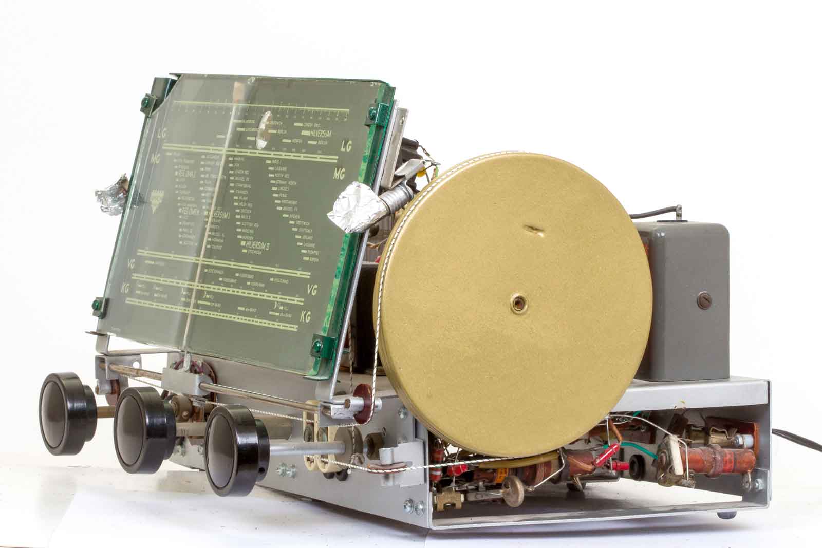 Het vooraanzicht, de linker knop is de volumeregelaar met net-schakelaar, de middelste is voor de afstemming en de rechtse is van de bandschakelaar.