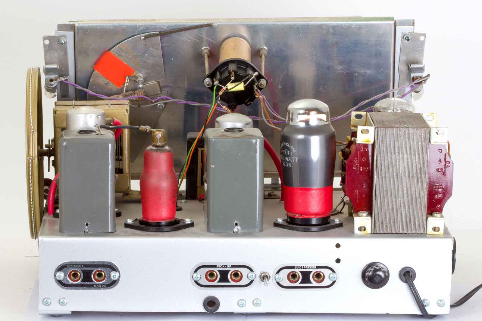 Op deze afbeelding is te zien dat ook de entrees voorzien zijn van teksten. Met het kleine schakelaartje naast de pick-up ingang kan de radio omgeschakeld worden van ontvanger naar LF-versterker . ( Wel een wat moderne schakelaar). Verder staan me de gebruikte kruiskop-schroeven tegen, dat wordt nog veranderd.