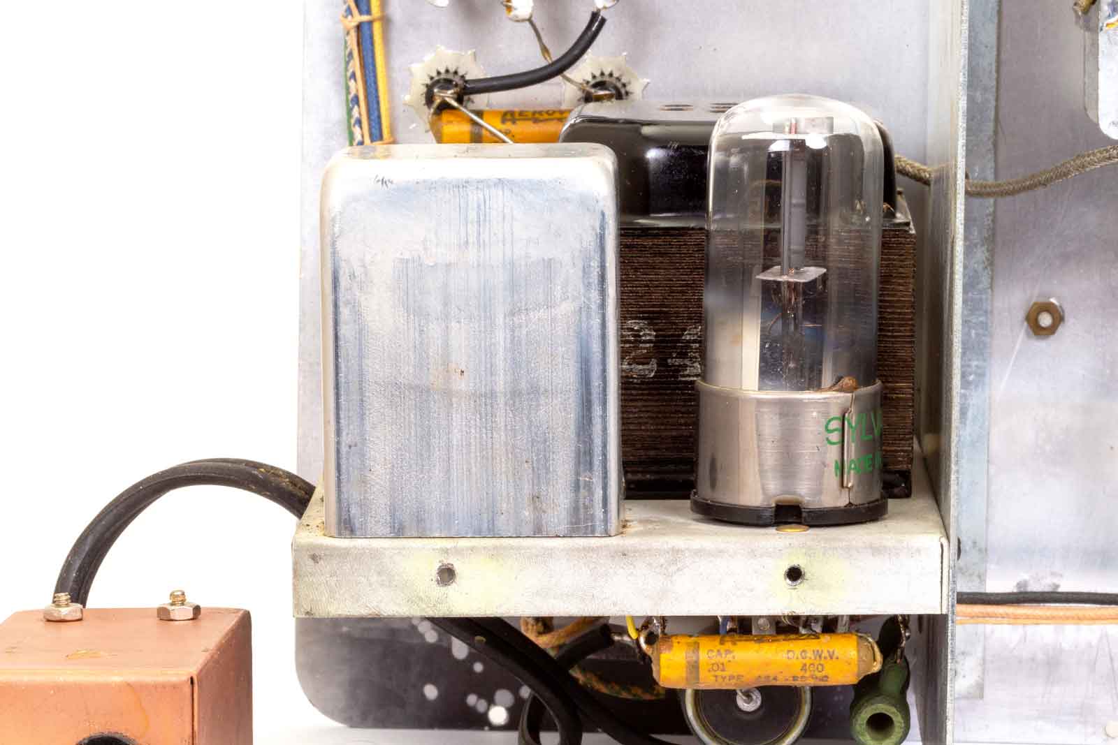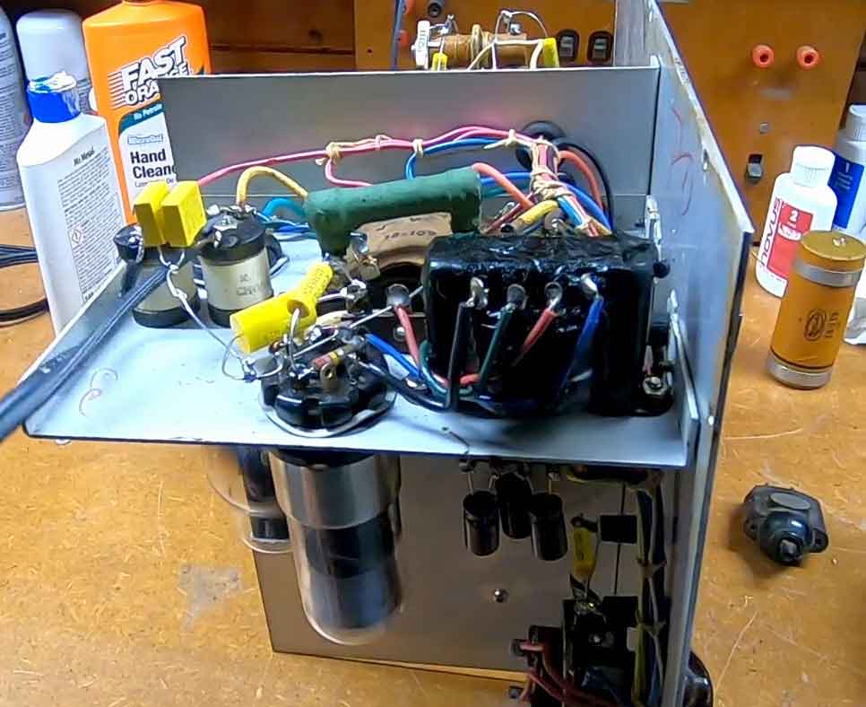 Dit is uitvoering met de LF-trafo onder het chassis. De gelijkrichter op de plek van de 6J5 en de 6J5 aan de kant van de afvlak-condensatoren.