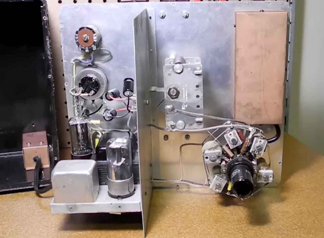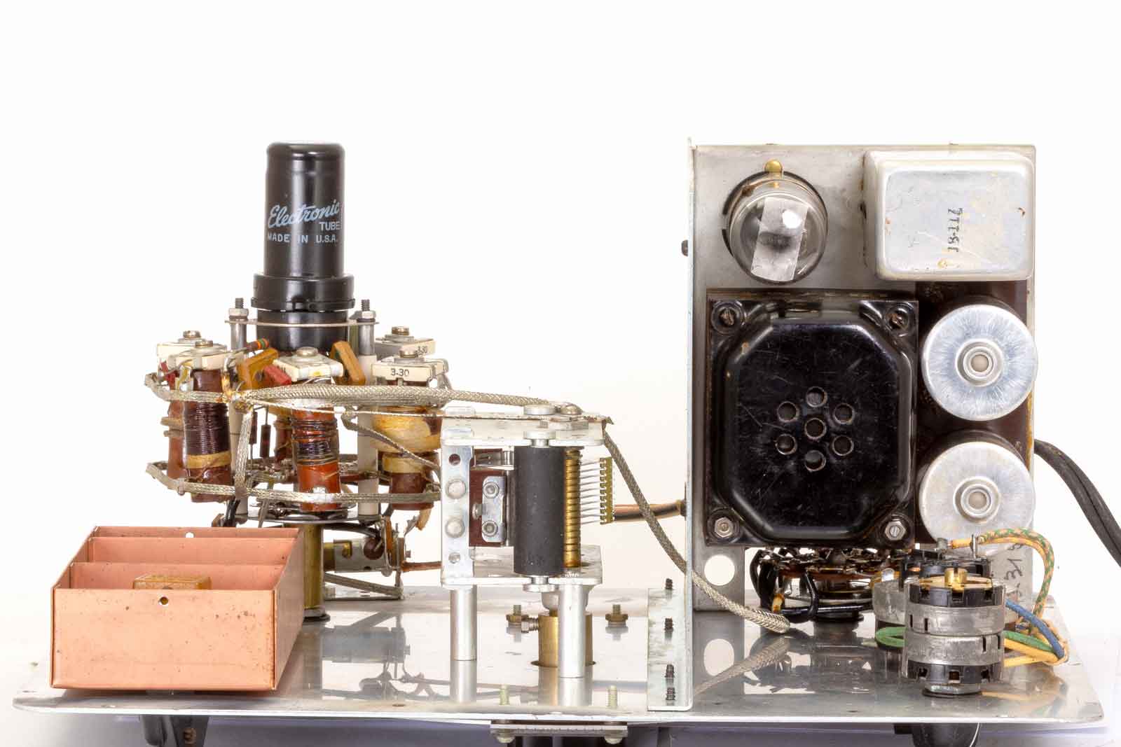De linker aluminium doos is de LF-transformator van de 400 Hz-oscillator. Rechts daarvan de 6J5 van de LF-oscillator.. De gelijkrichter is vervangen door vier 1N4007 dioden in een brugschakeling. De plaats, waar de gelijkrichtbuis ( 5Y3 of een 80) eigenlijk hoorde is bezet door een extra afvlakcondensator. In de latere modellen werd de LF-triode vervangen door een mengbuis (6U8). Het heptode-gedeelte werd gebruikt als LF-oscillator van het Wienbridge-principe. Dat scheelt weer in gewicht, want de LF-trafo is verdwenen. Het triodedeel werkte als katodevolger voor het leveren van de LF-uitgangsspanning.
