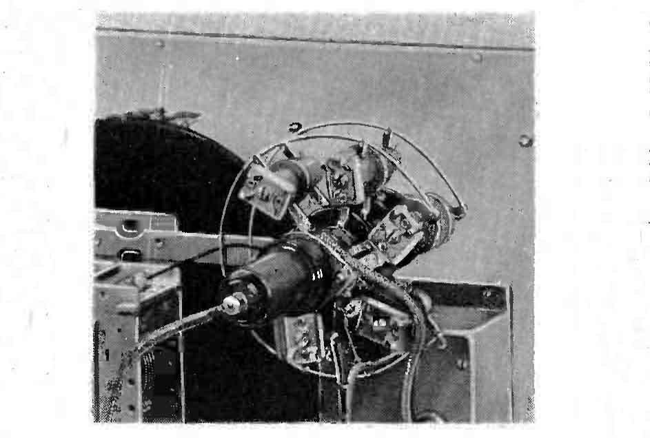 De afstem-condensator. 350 pF. Verbonden met een vertraging aan de afstemknop. Het zwarte ding boven op de C is een dikke rubberbuis die er voor zorgt dat de afstem-C in de uiterste stand (min. capaciteit) niet hard op de eindbegrenzing klapt.