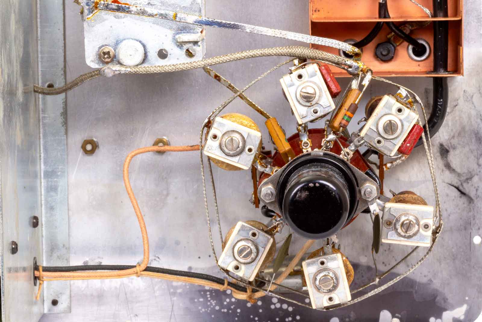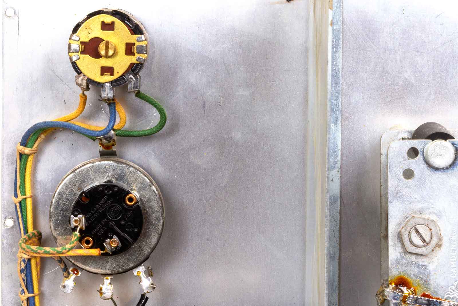 De bovenste potmeter is voor de instelling van de modulatiediepte. De potmeter eronder met de aan/uit-schakelaar voor de netspanning is de regelaar van de negatieve AVC-spanningsvoorziening.