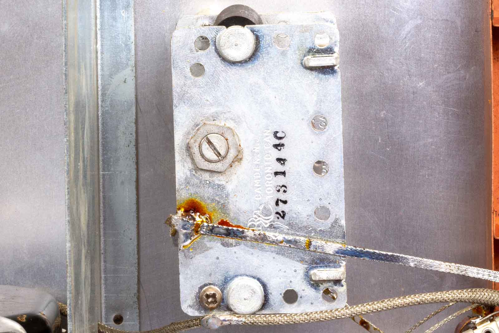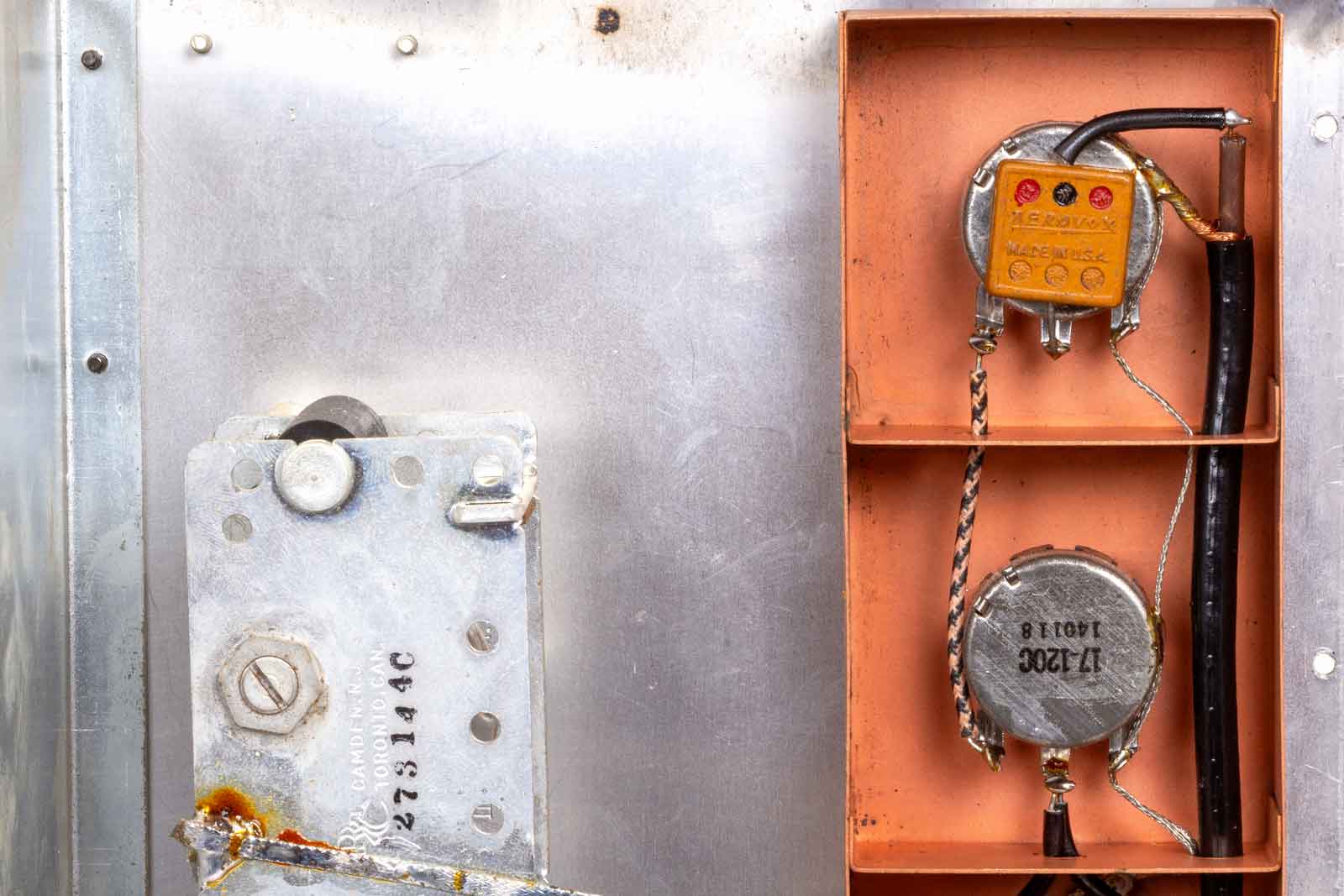 Links de aansluitingen van het netsnoer. Dan de twee VHF-smoorspoelen die weer verbonden zijn met twee HF-smoorspoelen. Van daaruit gaat het naar de aan/uitschakelaar en de voedingstrafo.De twee aansluitpunten voor de voeding van het binnenwerk zijn nog met twee "ratel-condensatoren" ontkoppeld. Dit zijn papier-condensatoren die het best kunnen worden vervangen. Het geheel is ondergebracht in een koperkleurig blikken kastje.