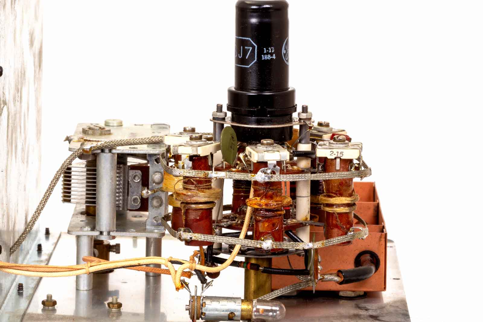 Zijaanzicht van de oscillator. Er is gebruik gemaakt van een soort desoldeer-litze om alle gemeenschappelijke verbindingen van de spoelsets met elkaar te verbinden.