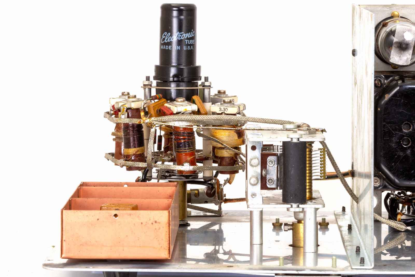 Aan de andere kant de afstemcondensator en de beide potmeters voor de regeling van de HF-spanning. De bovenste voor de grofregeling en de onderste voor de fijnafstelling. Alles netjes in een (weer) goudkleurige, blikken behuizing.