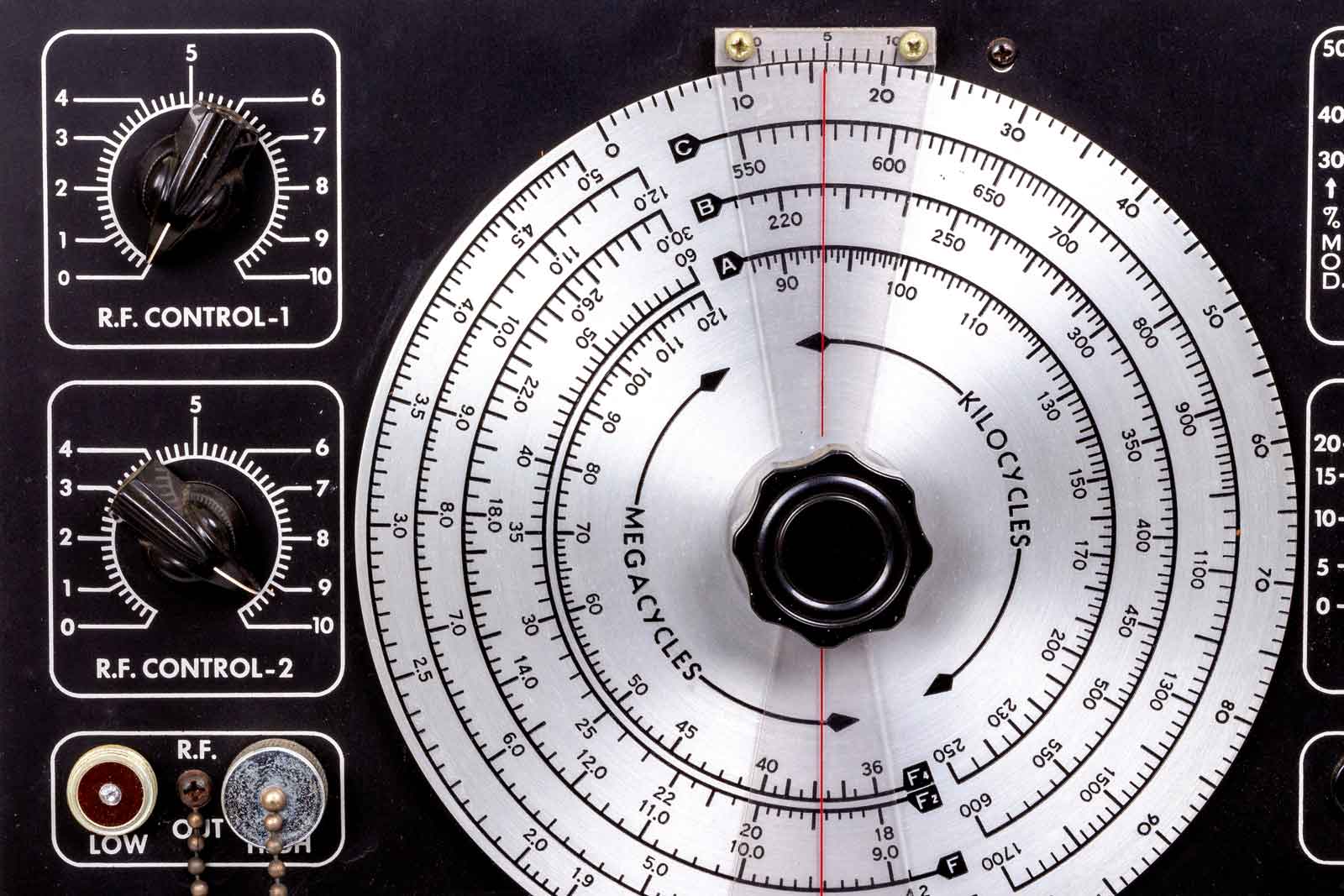Het meest in het oog springend is de grote schaal met daarop de schaalverdelingen van de acht banden. In werkelijkheid zijn het echter zes banden. De stand F wordt ook gebruikt met de tweede en vierde harmonische.
