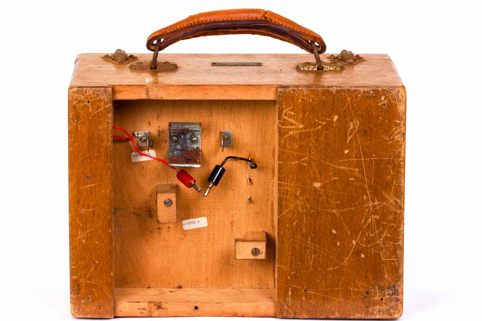 De plaats voor de batterijen. De drie uitsteeksels waarvan de bovenste met de zwarte draad met bananenstekker is voorzien, zijn de aansluitingen van drie contacten die verbonden zijn met de meter. Met een beetje passen en meten passen vijf 1,5 Volt batterijen in de hoogte opgestapeld in het vak. de zesde, aparte batterij heeft dan ook nog genoeg ruimte.