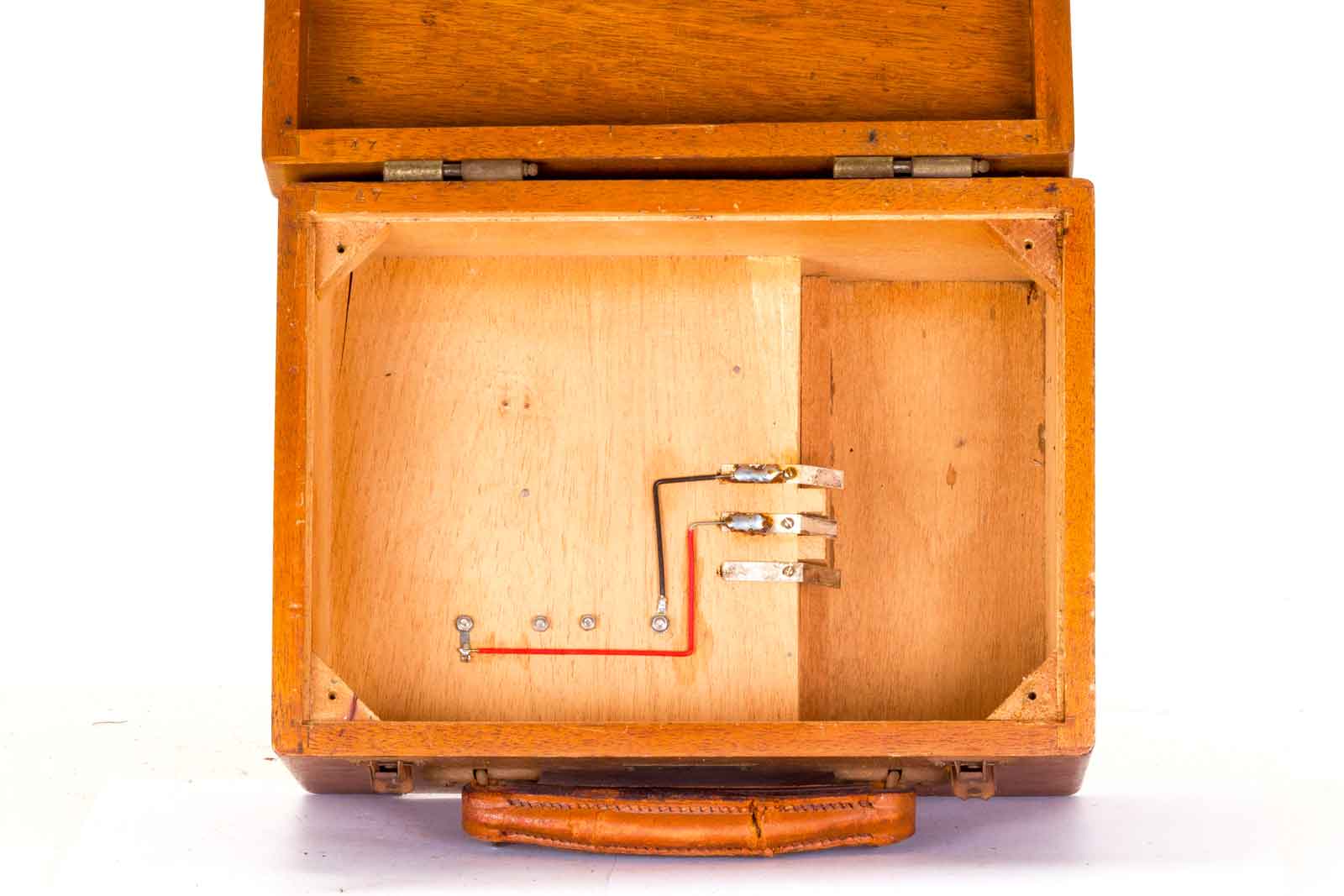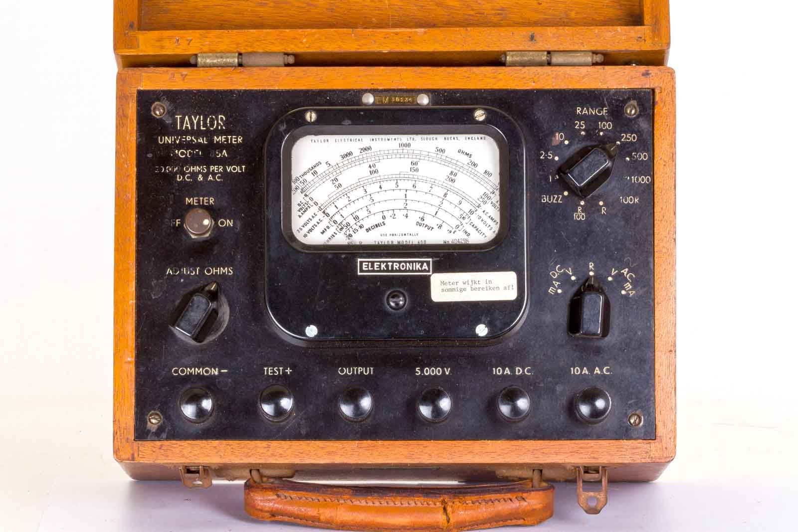 Voor de afwisseling maar weer eens een houten kastje gezien en voor een fotosessie uitgenodigd. Het is een multimeter of universeelmeter van eind jaren 40. De eerste modellen waren van 1946 en hadden 'voor de bruggelijkrichter nog vier van die mooie dioden uit WW2 militaire voorraden. Het type diode was Westector WX6. Het hier getoonde exemplaar had al een een wat modernere brugcel, zo'n grijs of zwart ding, maar ook uit die jaren. Deze cel werd gebruikt om wisselspanningen en stromen te kunnen meten met een draaispoelmeter.