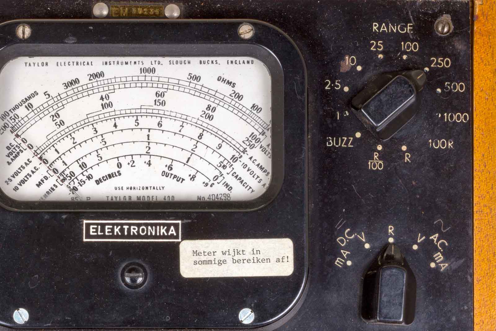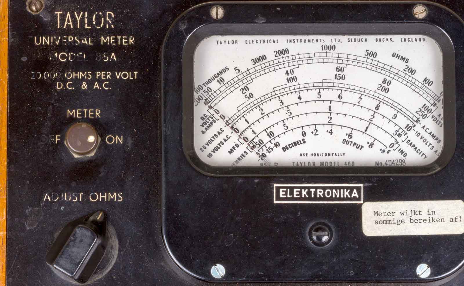 En zo ziet de meter er uit. De teksten zijn door het veelvuldig gebruik wat beschadigd, misschien wel door de chemicalien die in het laboratorium verwerkt werden...