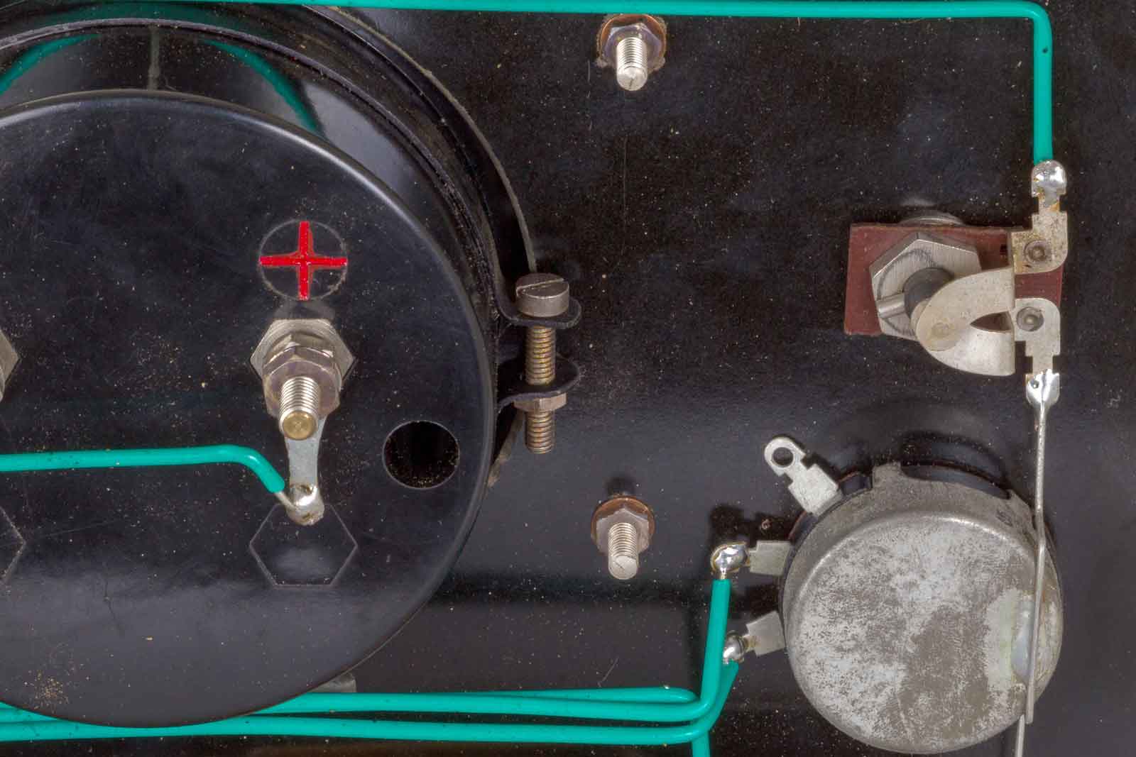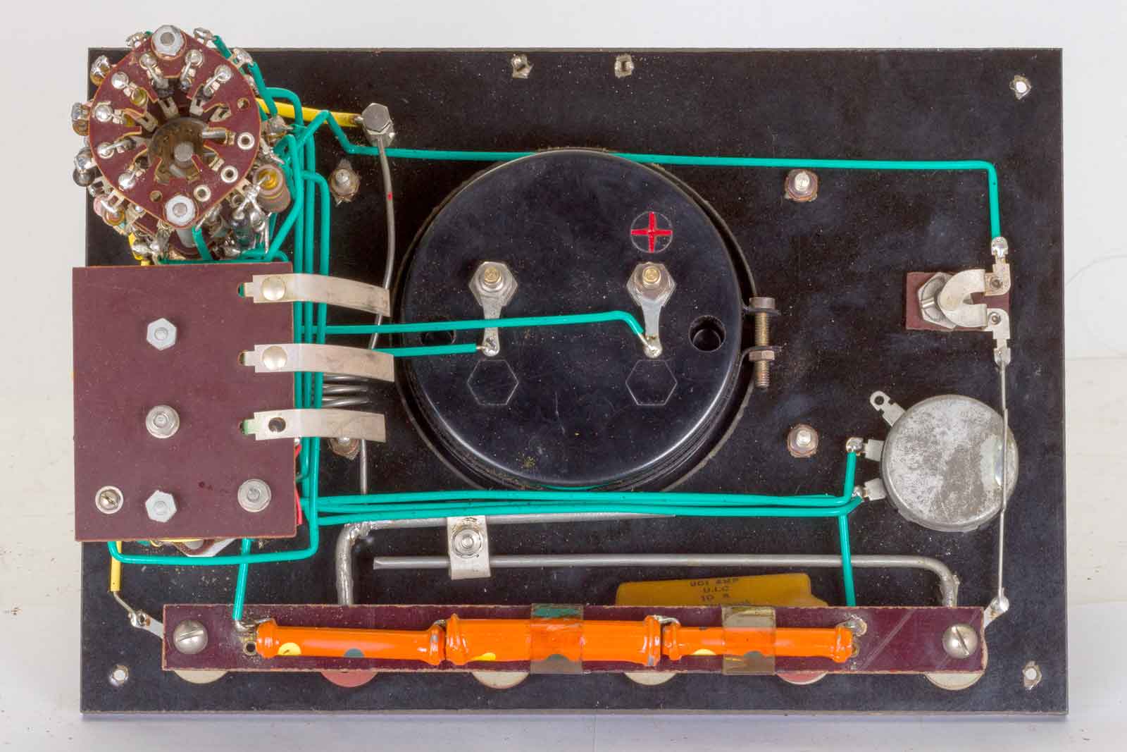 De beide schakelaars, eerst dacht ik dat het bovensete deel van de linker schakelaar defect was, de rotor was weg. Maar dit dek werd puur als een soort weerstandbordje gebruikt. Rechts boven, binnen in de schakelaar is de zwarte brugcel te zien. De grijze cel is een helft van een brug ter bescherming van de meter.