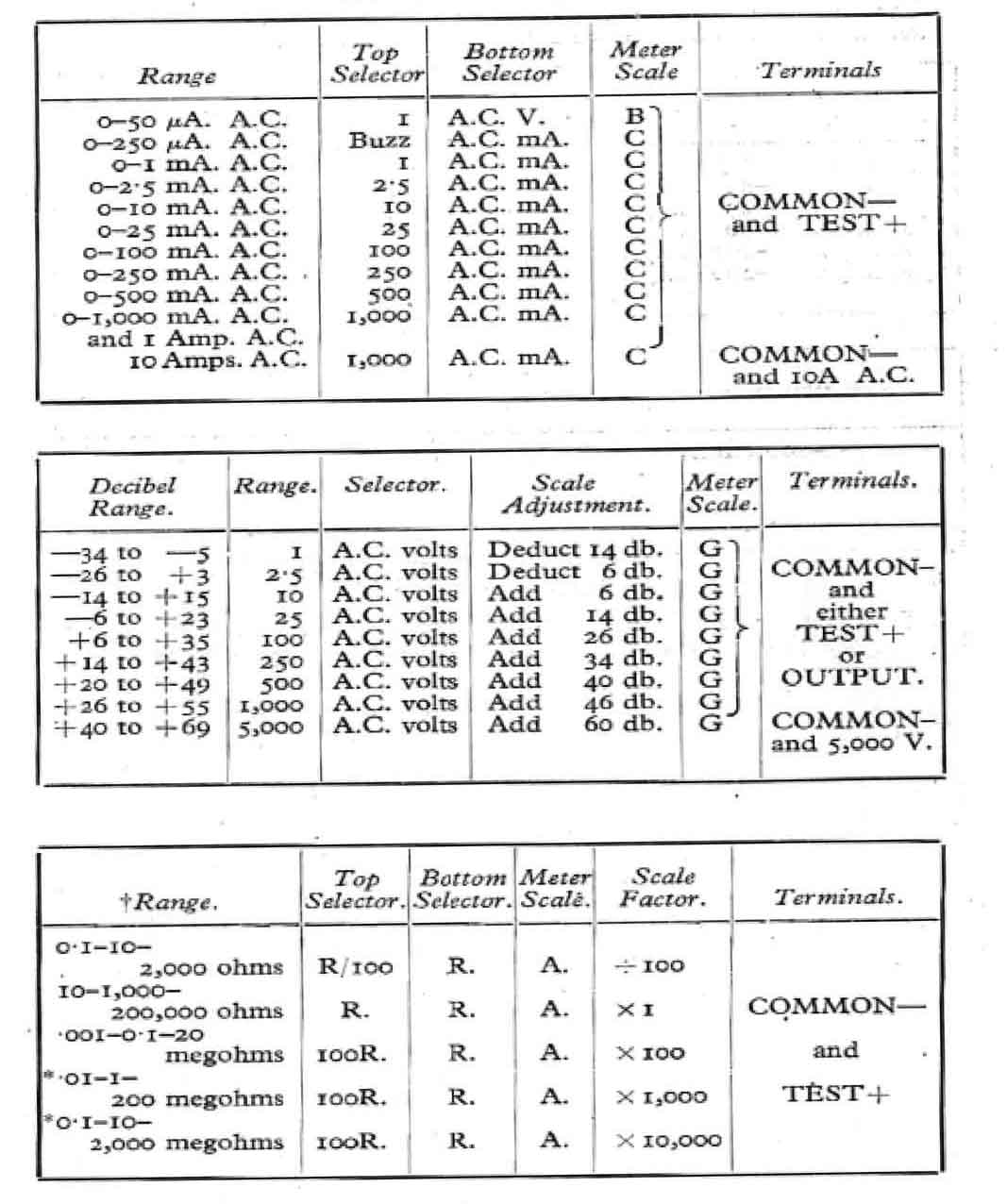 Bovenaanzicht, links de drie contactstrippen met daarboven de bereikschakelaar. In het midden de meter. Rechts de "Meter-switch" en de instelpotmeter voor de weerstandmeeting. Onder de drie serieweerstanden voor het 5000 Volt-bereik.