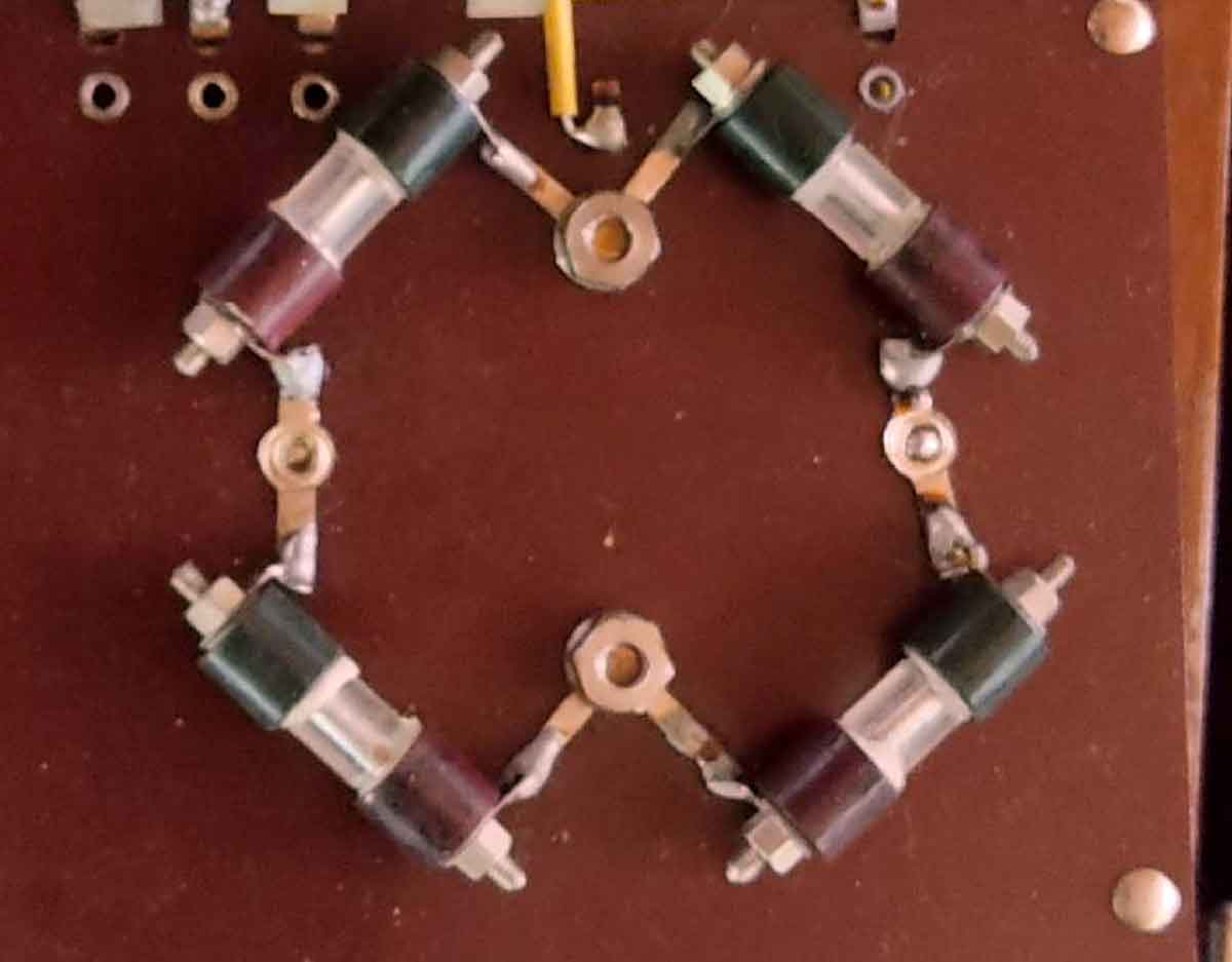 In de oudere instrumenten was boven op de plek van de meteraansluiting dit bordje met de brugcel bestaande uit Westector dioden geplaatst.