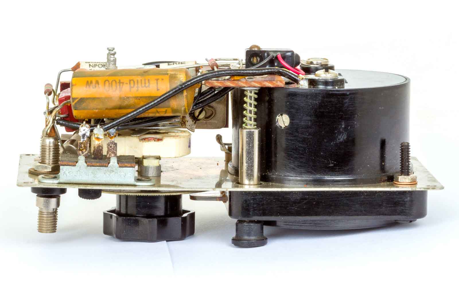 De zijkant met de spoel-aansluitingen. De zwarte draad naar de meest linkse bus is de antenne-aansluiting ANT1 die direct aan V1 ( de 1N34) is aangesloten en via de capacitieve spanningsdeler C3-C4 op de spoel uitkomt. De aansluiting ANT2, rechts op de meter is via C7 ( 5 pF) verbonden met de spoel.