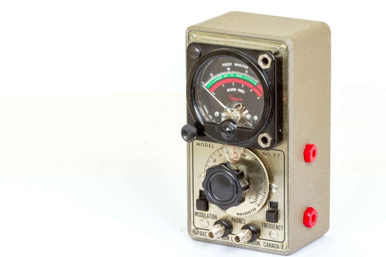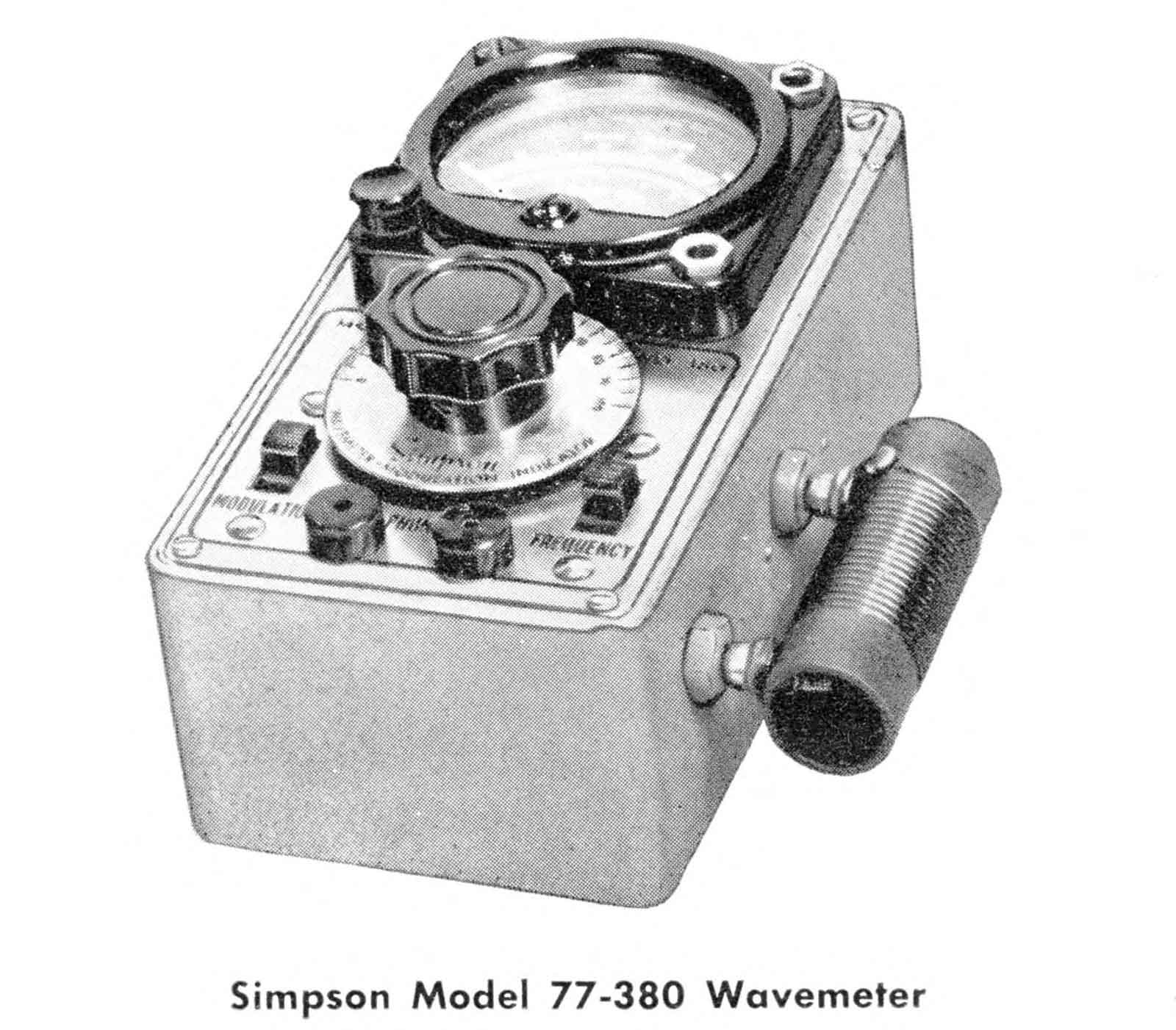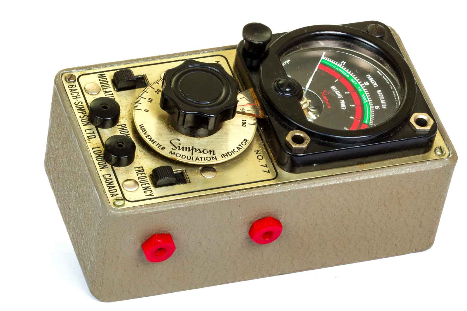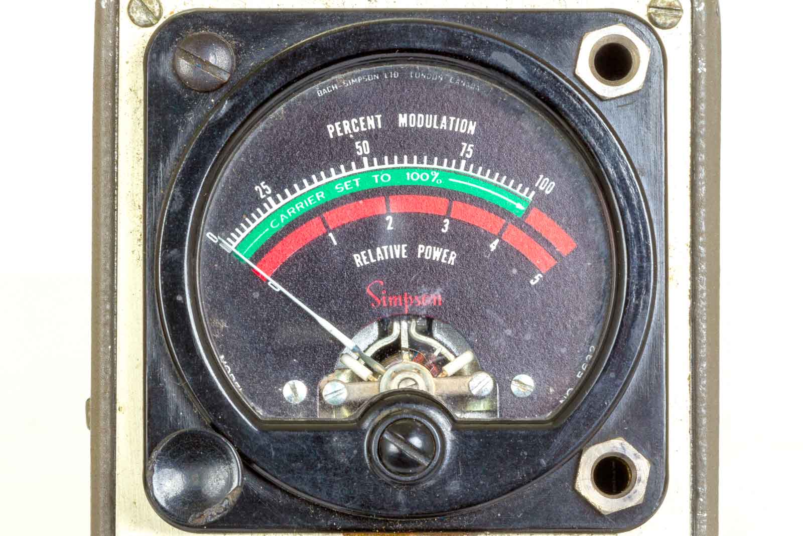 Het meetinstrument met twee schalen, "Percent Modulation" en "Relative Power". De Simpson ( De firma met de befaamde universeelmeters) draaispoelmeter van 100 muA. Links onder een drukknop van een schakelaar en rechts twee bussen voor het aansluiten van een antenne.