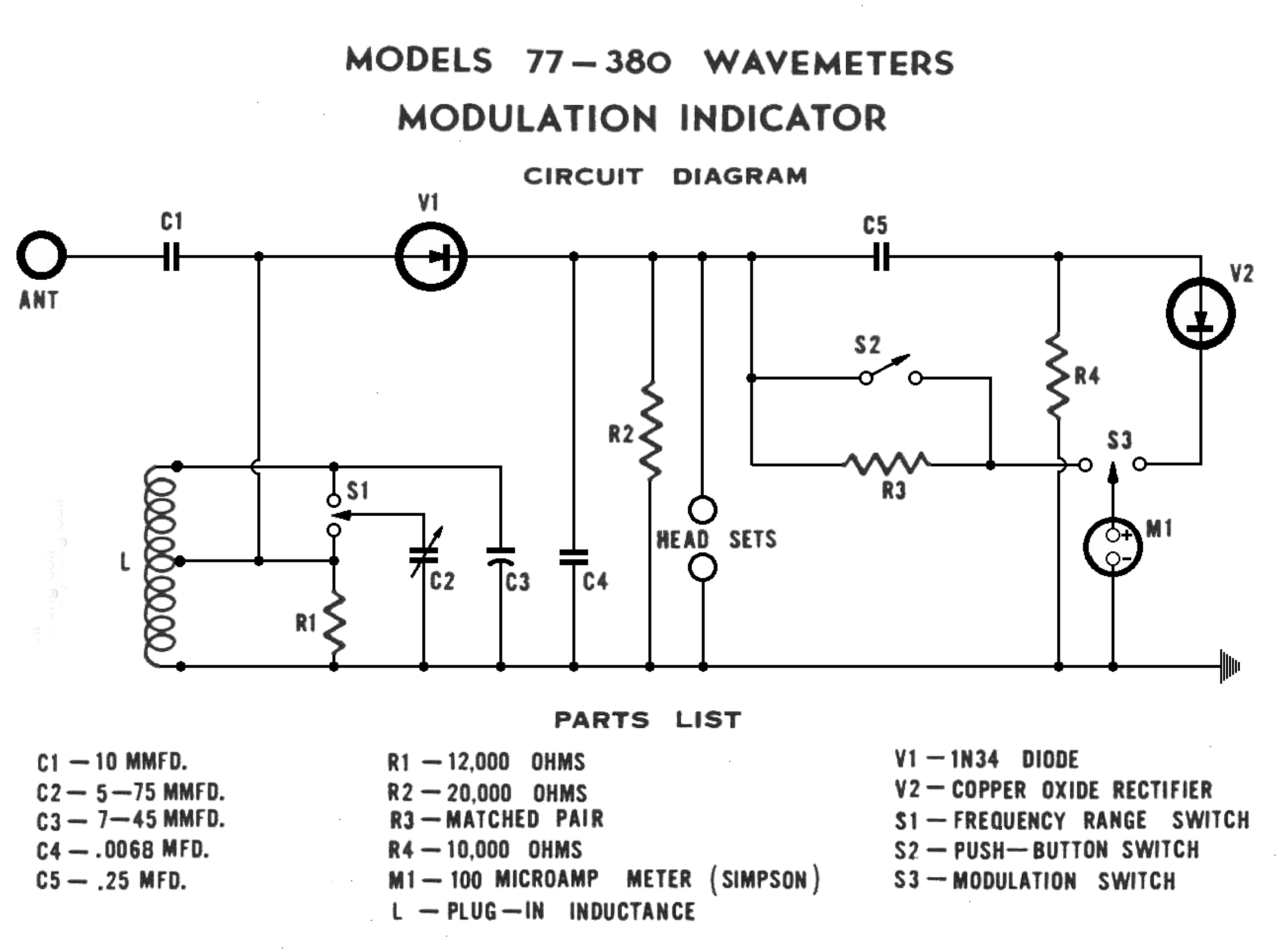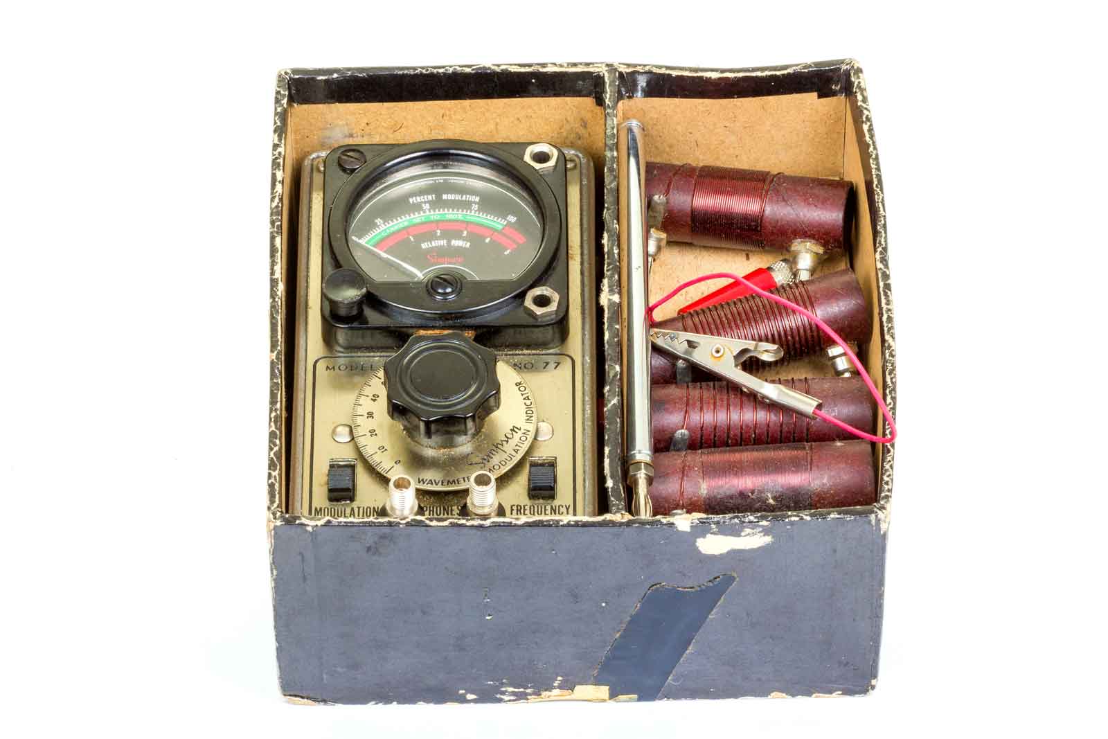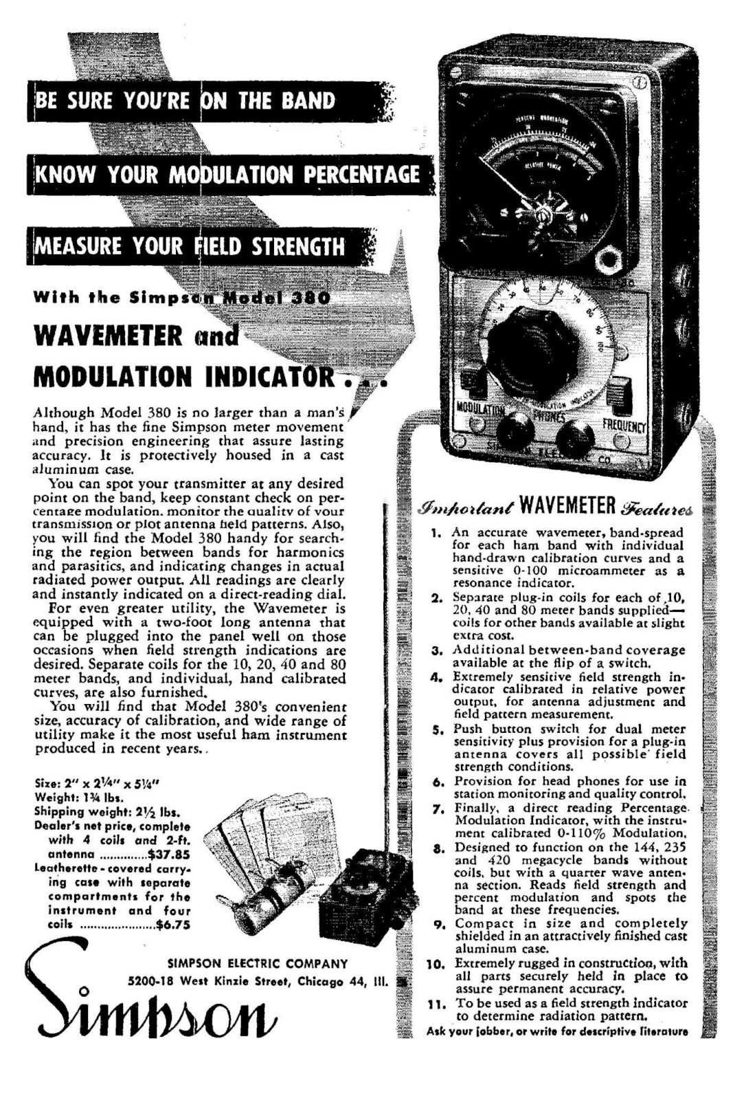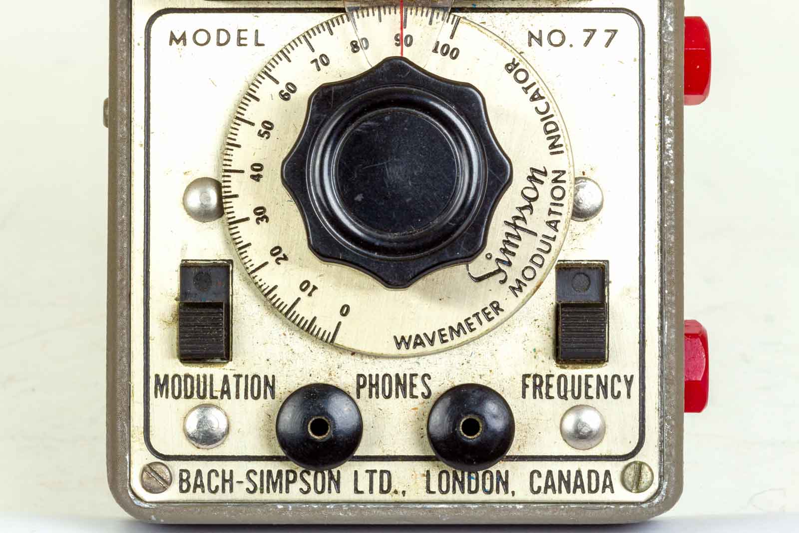 Het meetinstrument met twee schalen, "Percent Modulation" en "Relative Power". De Simpson ( De firma met de befaamde universeelmeters) draaispoelmeter van 100 muA. Links onder een drukknop van een schakelaar en rechts twee bussen voor het aansluiten van een antenne.