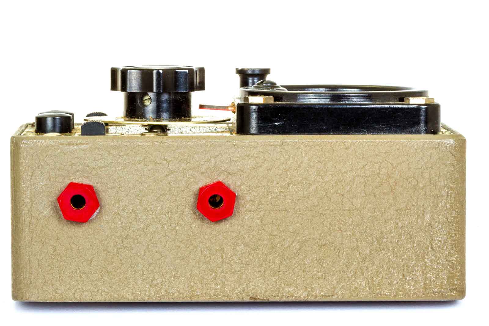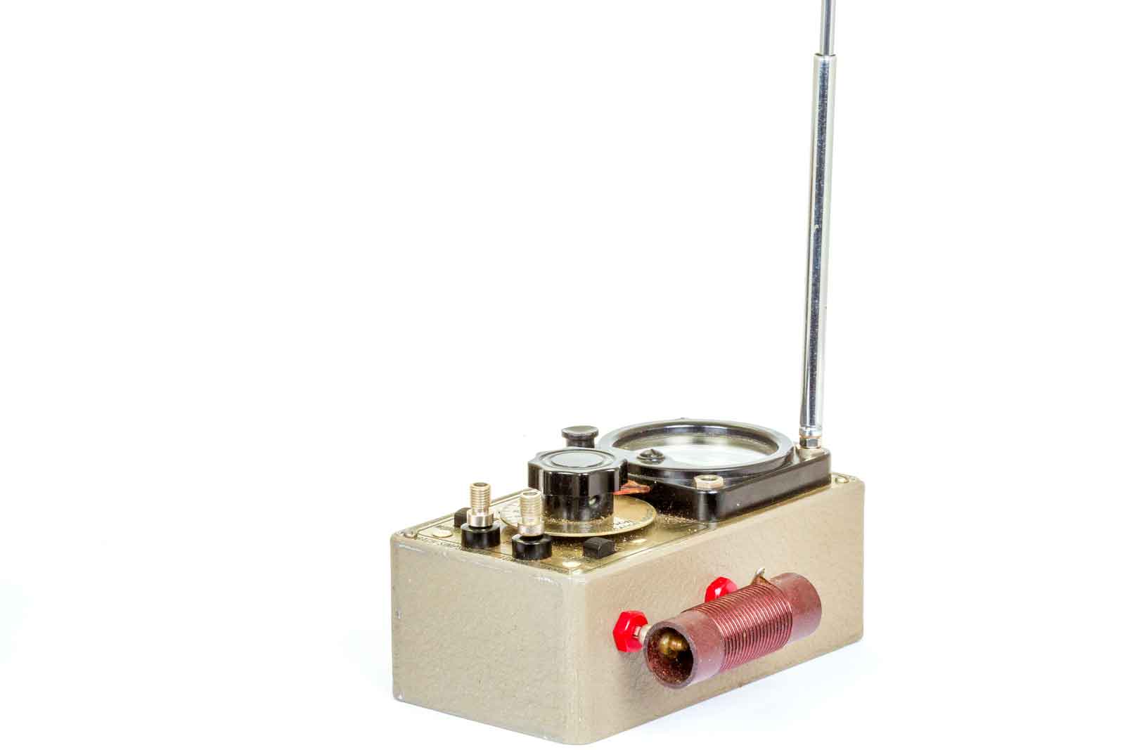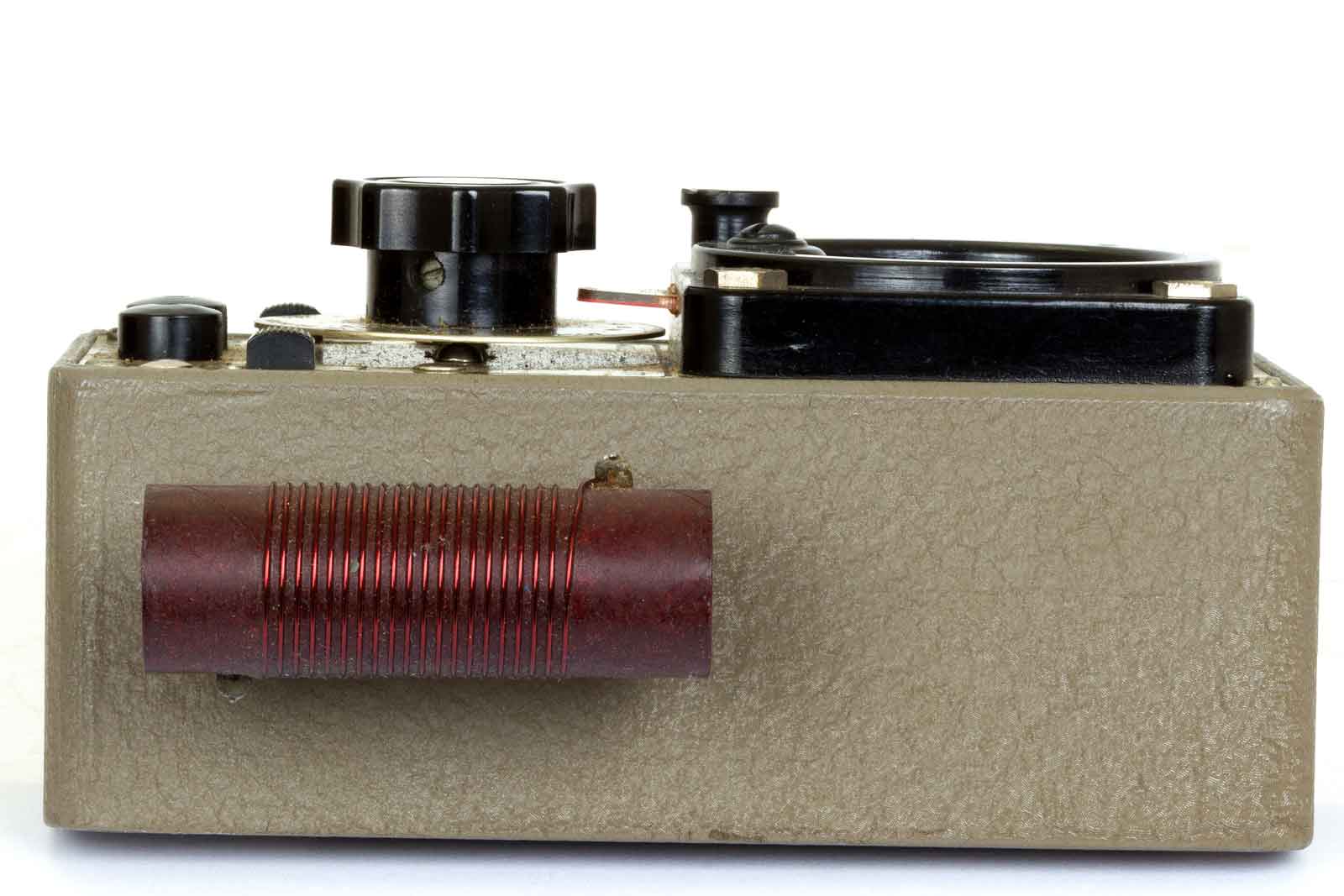 Hoewel deze telescoopantenne niet meegeleverd was, maar een fiberglasbuisje met daar in een antennedraadje, heb ik foto's in advertenties gezien met een telescoopantenne. Je kunt de meter dus prima gebruiken als veldsterkte meter. De spoel wordt zo in de zijkant geprikt.