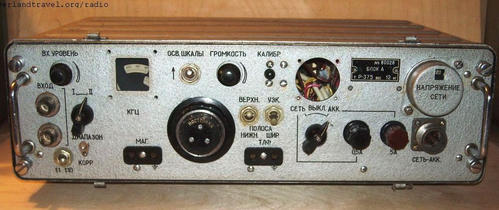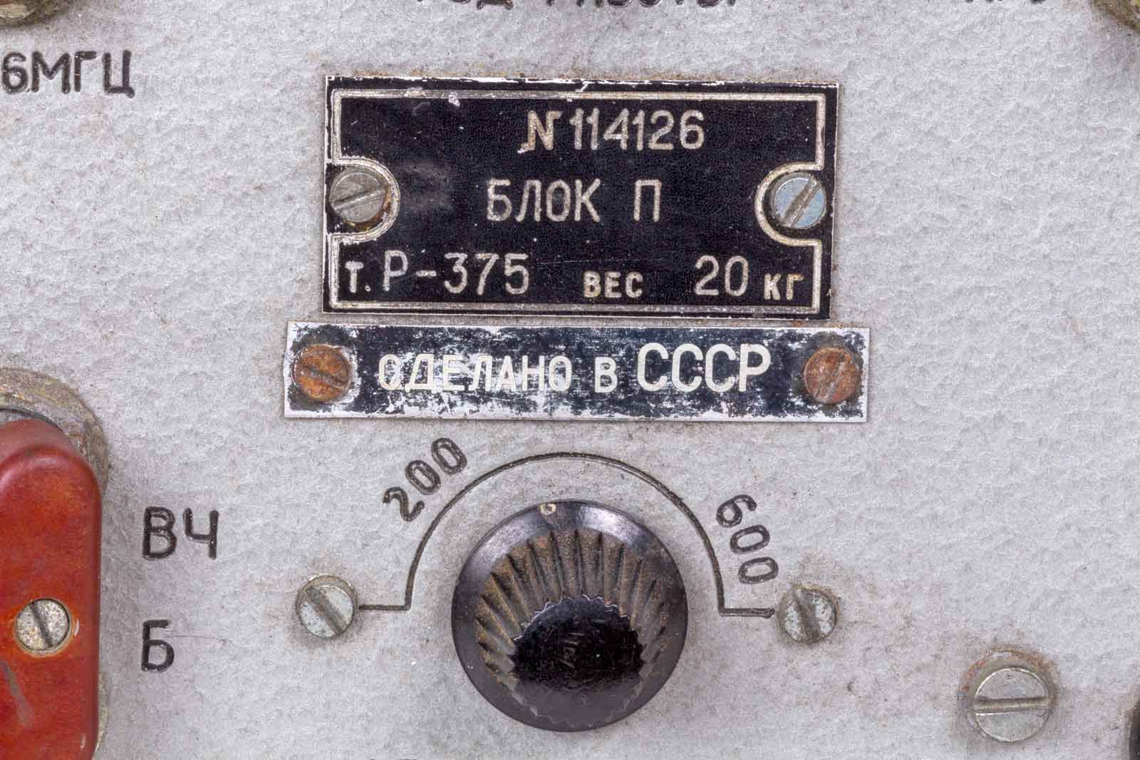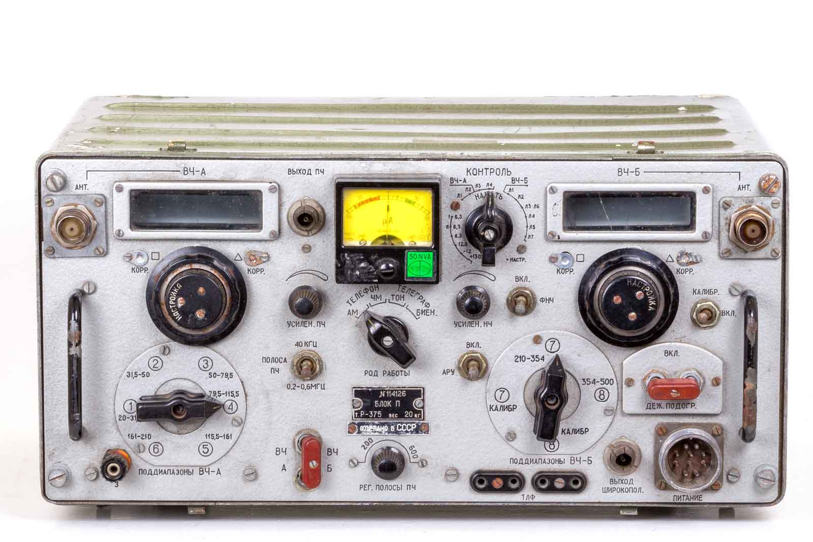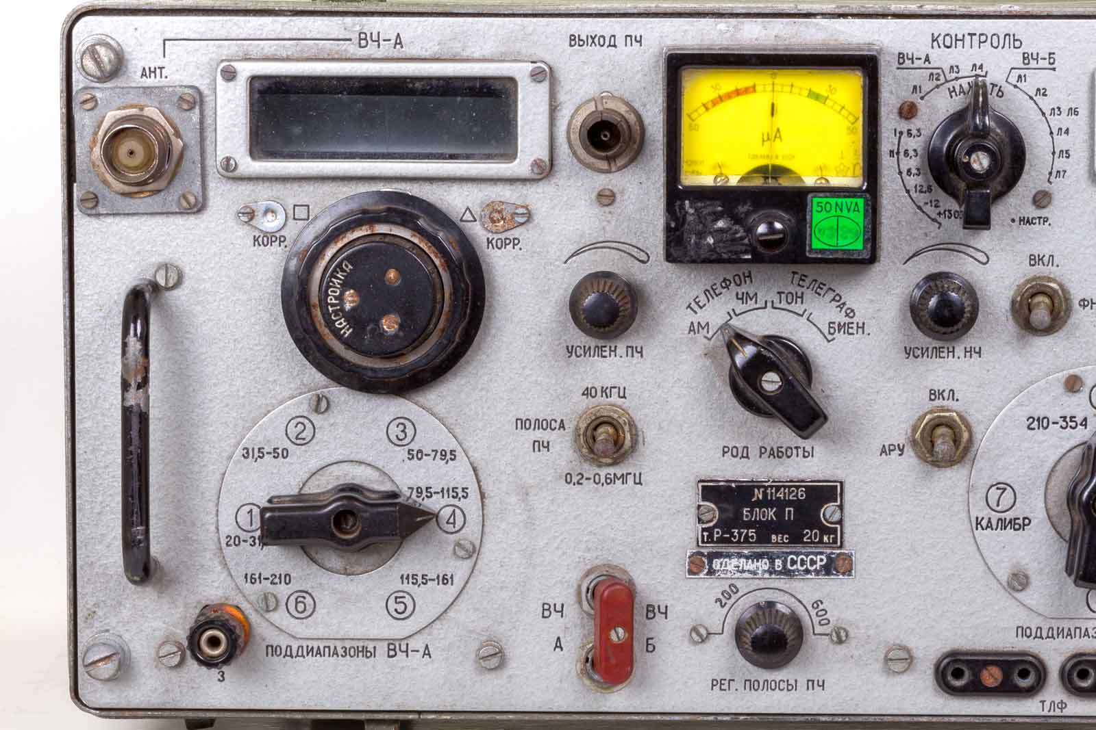 ,Telefonie, AM, FM en Telegrafie MCW , CW. Daar onder het typeplaatje met serienummer N114126, Blok P () wat dat ook mag betekenen) TR-375 en gewicht 20 kg. Gemaakt in de USSR. Daar onder een knopje voor de IF-bandbreedteregeling, 200 of 600 kHz. De knop links van de modeschakelaar is IF-versterking. De schakelaar er onder is de selectie van de bandbreedte 40 kHz of o,3 -0,6 MHz. Daar onder de keuzeschakelaar RF-ingang A of B. Hierbij is A de VHF-ontvanger van 20 tot 210 MHz.