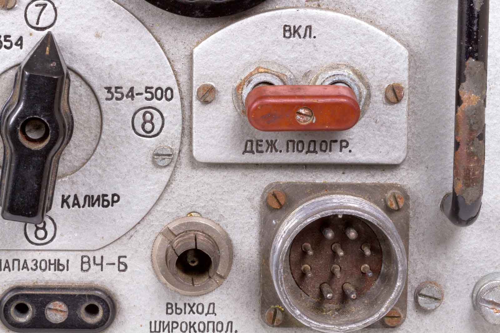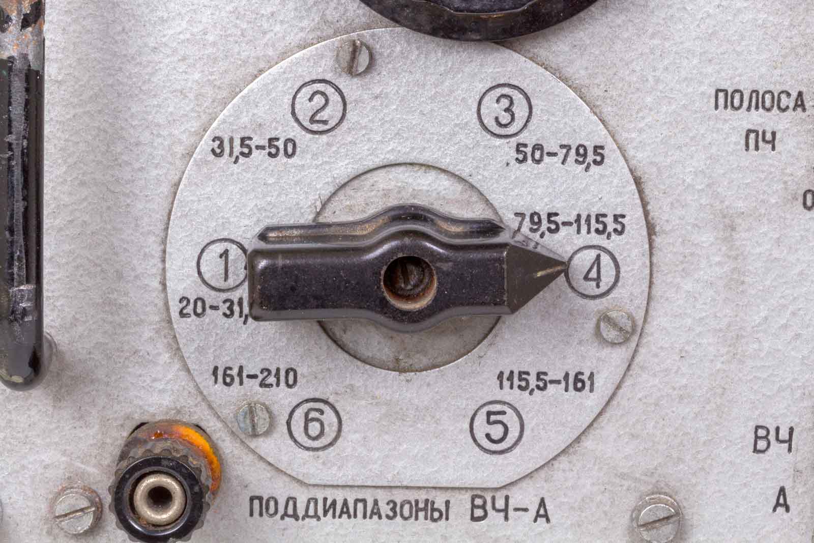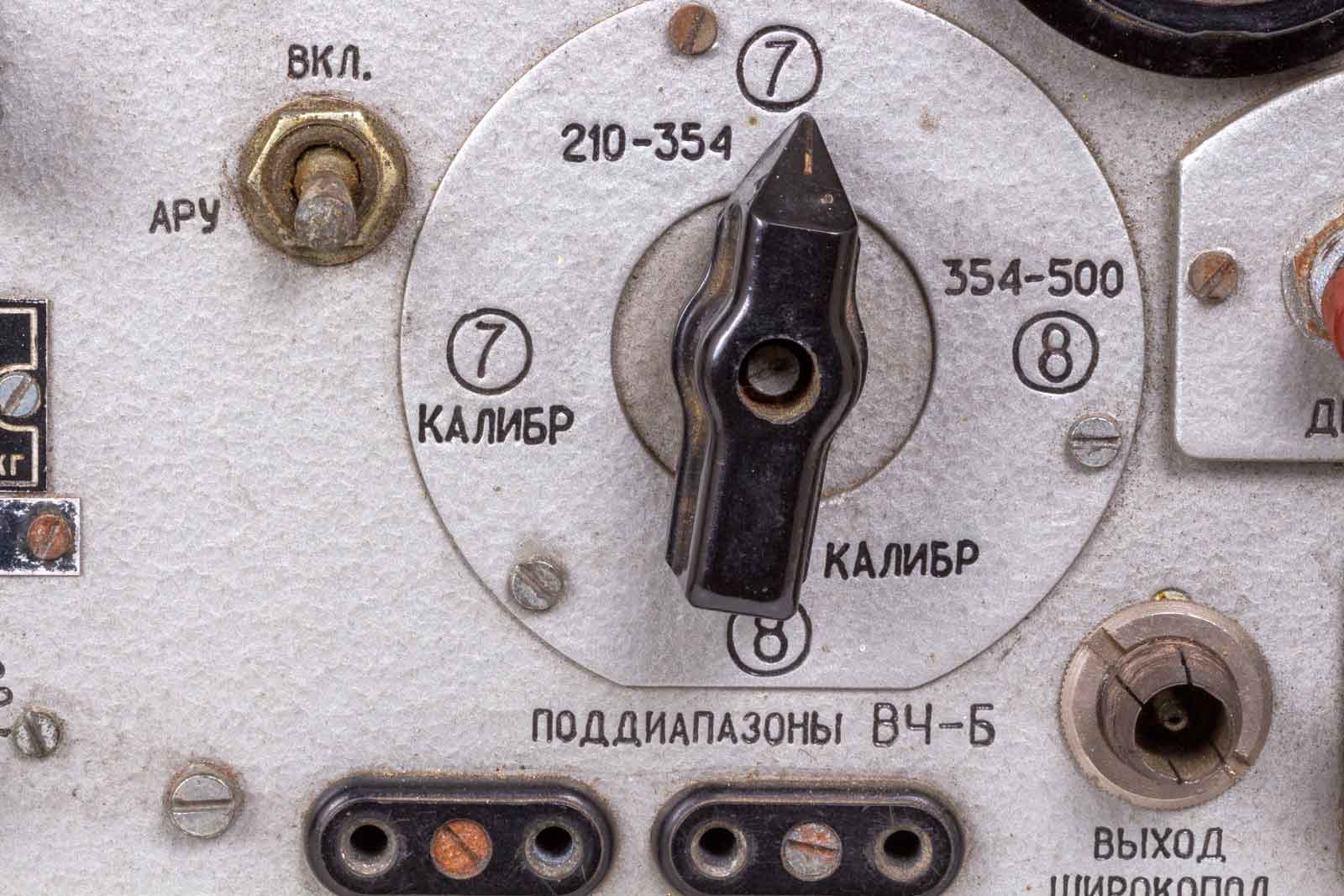 De bereikschakelaar voor 210-354 MHz en 354 - 500 MHz. De andere standen 7 en 8 zijn voor calibratie. De beide stop-contacten zijn van de LF-uitgang (0,3-2,5 kHz ) voor de hoofdtelefoon. Rechts daarvan is een LF- breedband-aansluiting(tot 400 kHz) . Deze wordt gebruikt om het LF-signaal te gebruiken voor het opnemen (bandrecorder) van muziek in hoge kwaliteit..