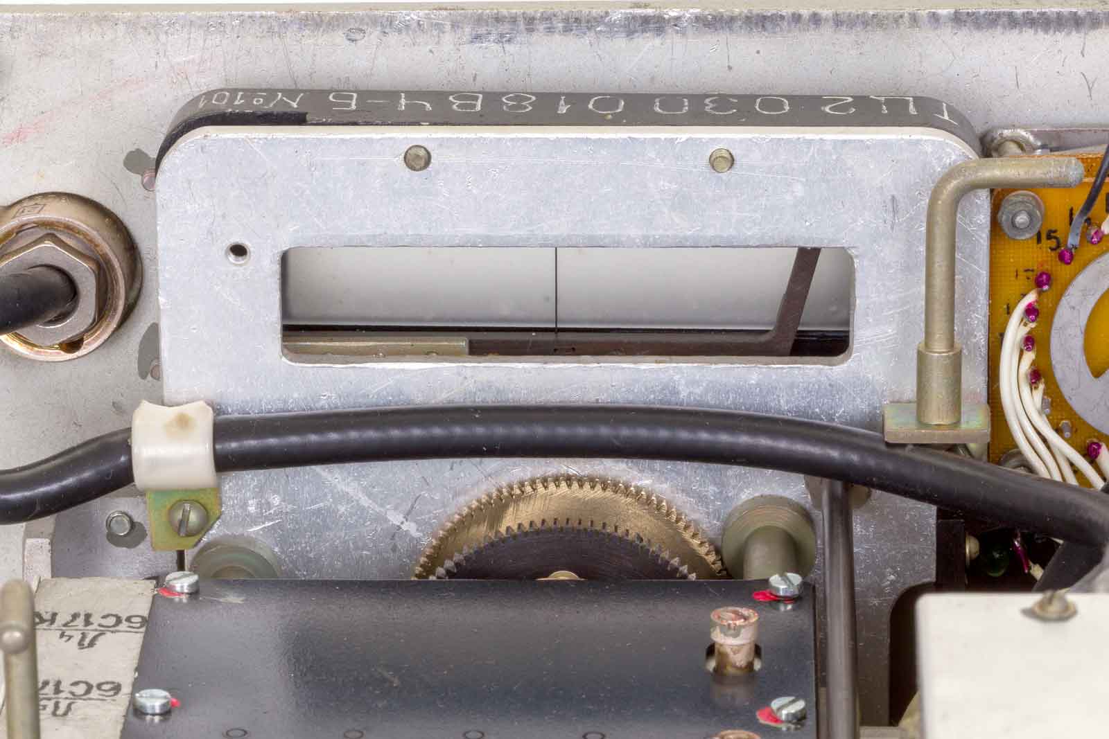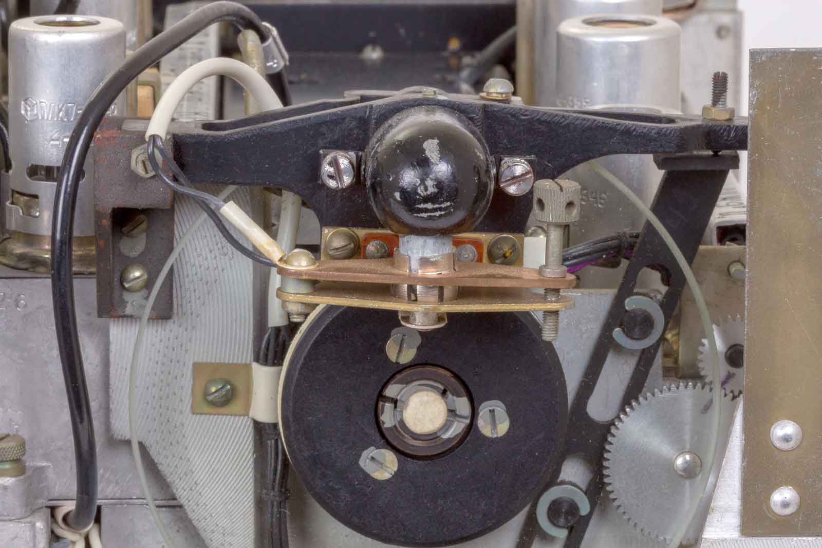 Op deze foto is de fitting te zien van het schaallampje. Rechtsboven de wals die de juiste positie van de schaal instelt en bediend wordt door de bereikschakelaar. Het lijkt wel een versnellingsbak.
