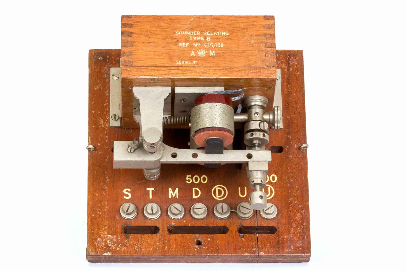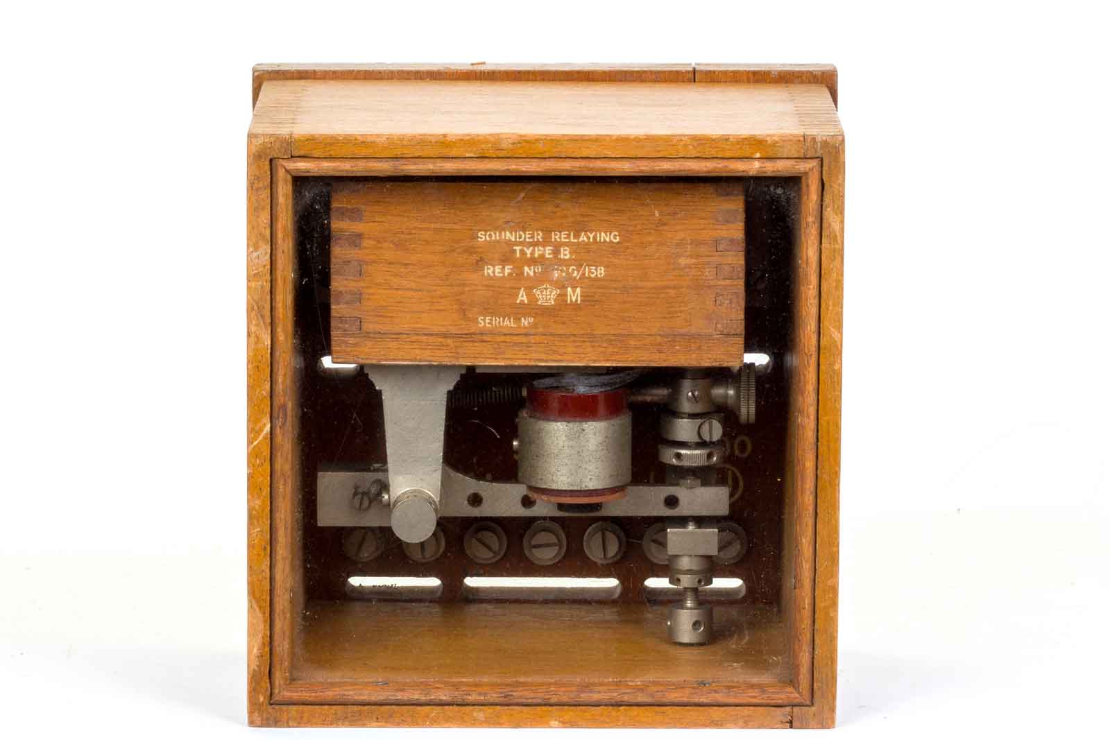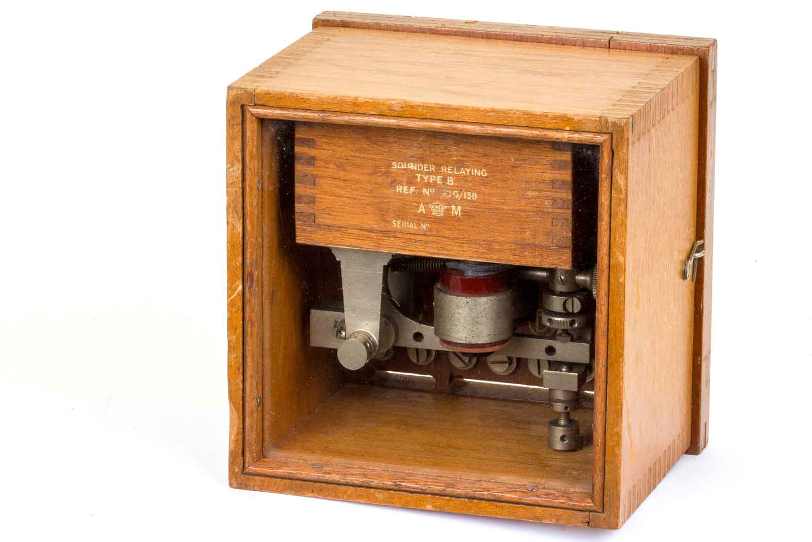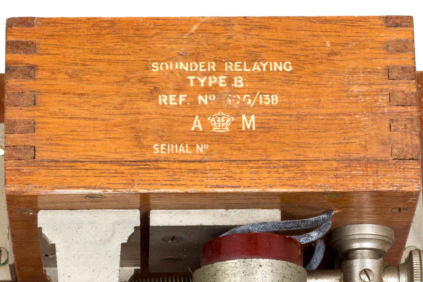 Netjes op het hout aangebracht de gegevens van het Air Ministry, waarschijnlijk is het relais een product geweest voor de civiele markt en omgedoopt als A-M model.