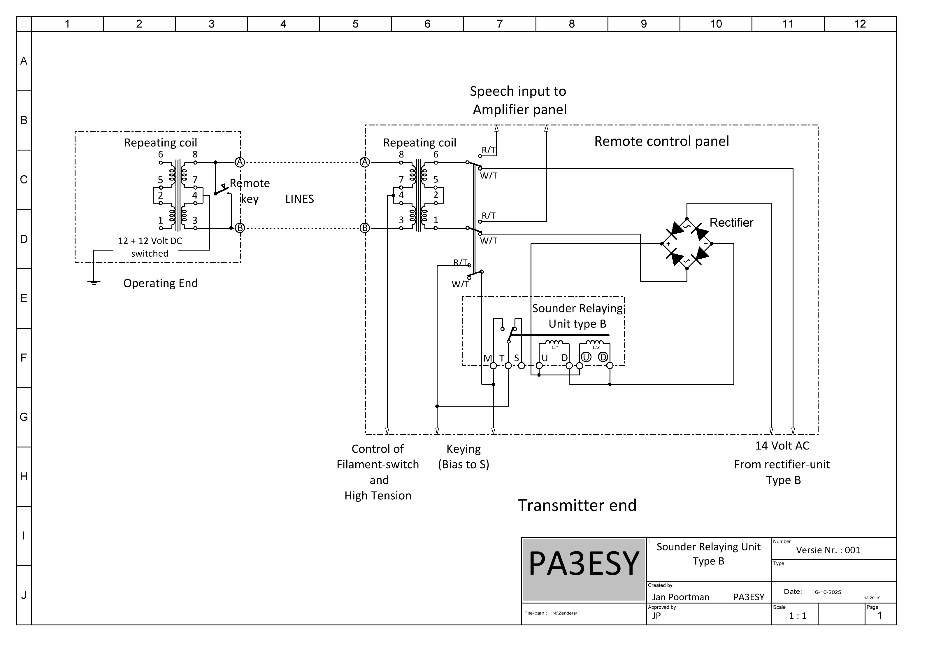 En zo ziet zo'n besturing er uit. De werking van de sounder-relaying unit type B. Een uitermate slim systeem, het heeft even geduurd voor ik uitgevonden had hoe het werkte. Vanaf een op afstand geplaatste remote control-unit wordt het remote control-panel aangestuurd via twee lijnen, A en B en aarde. De signalen die over die lijn moeten gaan zijn: Aan/uit van de gloeidraden van de zender, het inschakelen van de hoogspanning en het LF-signaal van de koolmicrofoon. De eerste twee functies worden met een gelijkspanning van 24 Volt uitgevoerd. Een ingewikkelde schakelaar zorgt er voor een DC-spanning op de middenaftakking van de remote repeating coil zorgt via de beide windingen dat de signalen op de lijnen A en B komen. De aarde wordt gebruikt voor de andere pool. Deze spanning komt aan op punt A en B van het remote control-panel van de zender. Ook hier bevindt zich een repeating coil die ook over een middenaftakking beschikt. De gelijkspanning zorgt dan voor het activeren van (hier niet getekende) sounder relaying units die op hun beurt de gloeispanning en hoogspanning inschakelen. Dan kun je nog kiezen voor RT (radio-telefonie) of CW. In de RT stand wordt via een microfoon-trafo het koolmicrofoonsignaal ( de accu van 24 Volt zorgt voor de gelijkspanning van 12 Volt voor de koolmicrofoon). De geproduceerde wisselspanning gaat keurig via de lijnen A en B naar de repeating coil van de zender en gaat van hier uit via de R/T-W/T-schakelaar naar de ingang van de modulator-versterker. Dat is nog tamelijk simpel. Maar nu het sleutelen van de zender. Dat lukt met een zwak signaaltje op de lange lijn-verbinding niet zo goed. Verder is dat ook levensgevaarlijk vanwege de hoge spanning op de key-contacten. Wat hebben die slimmerikken nu bedacht....