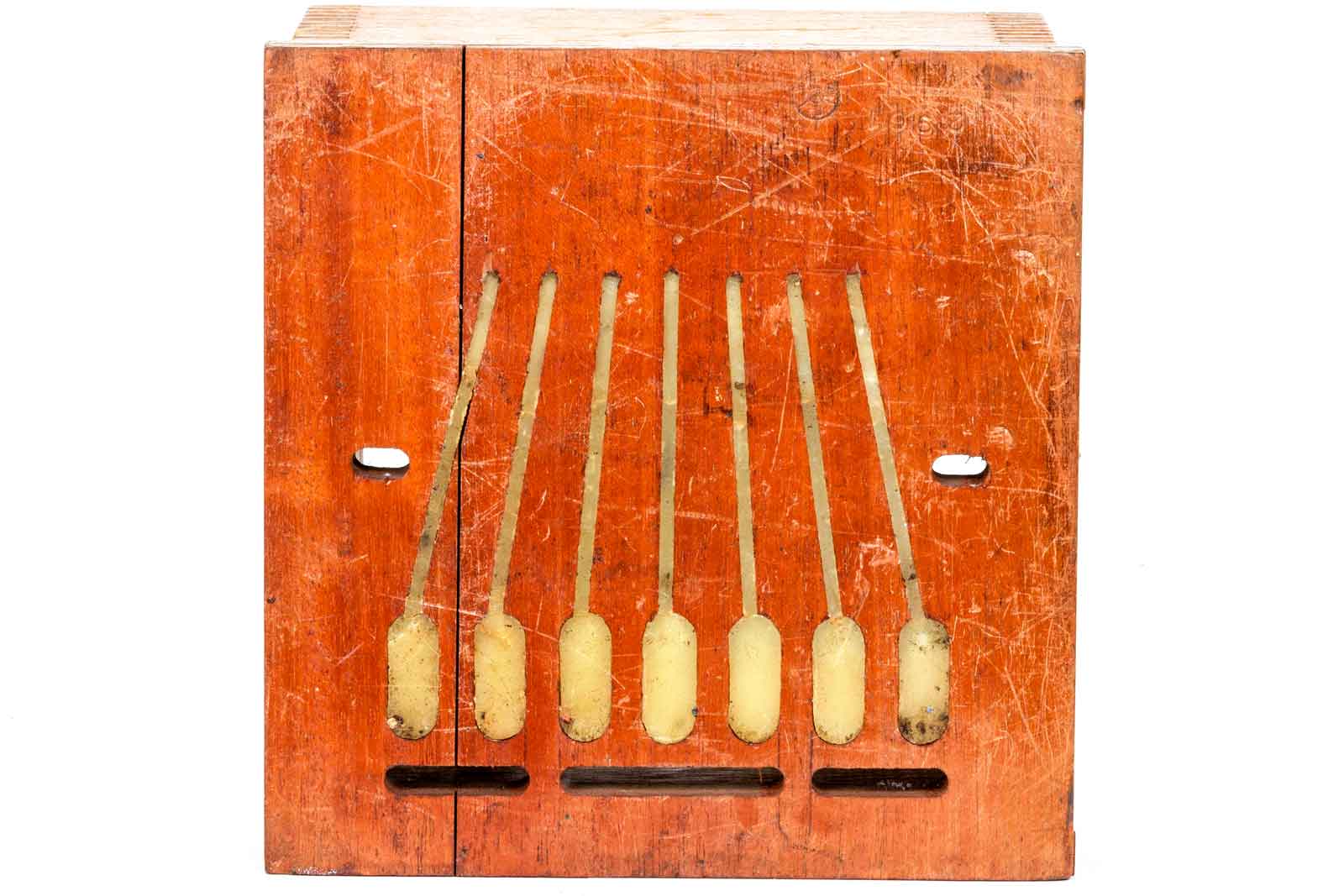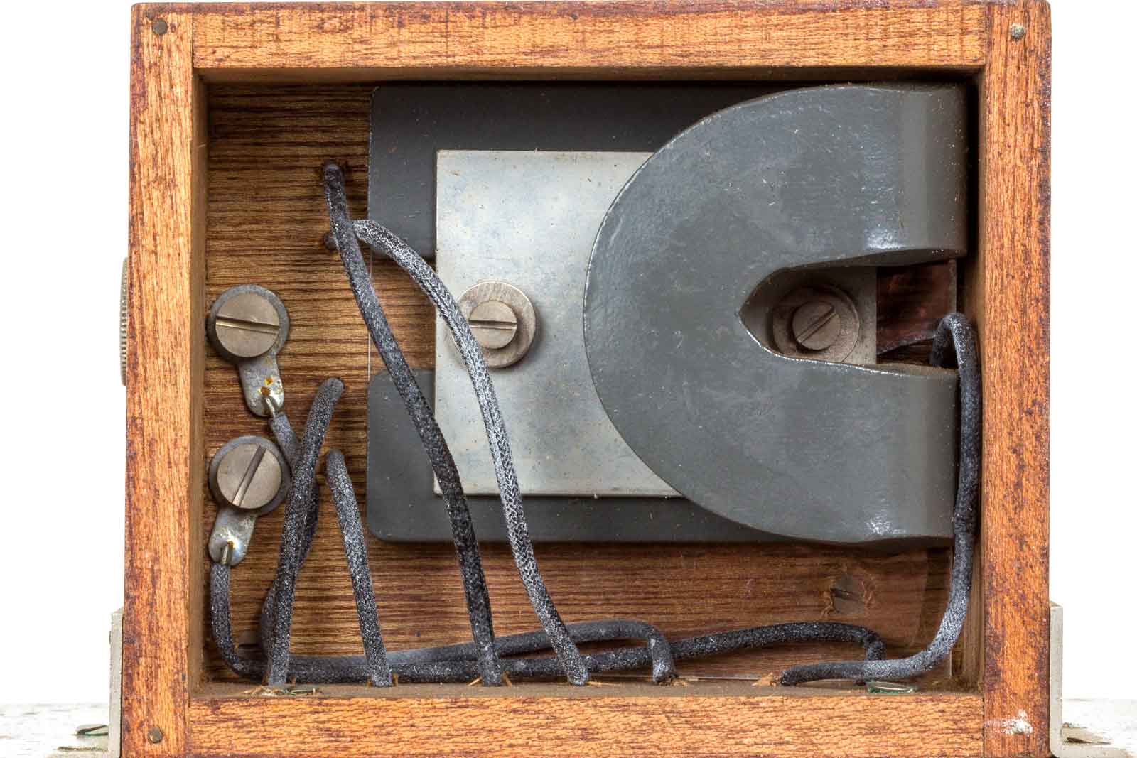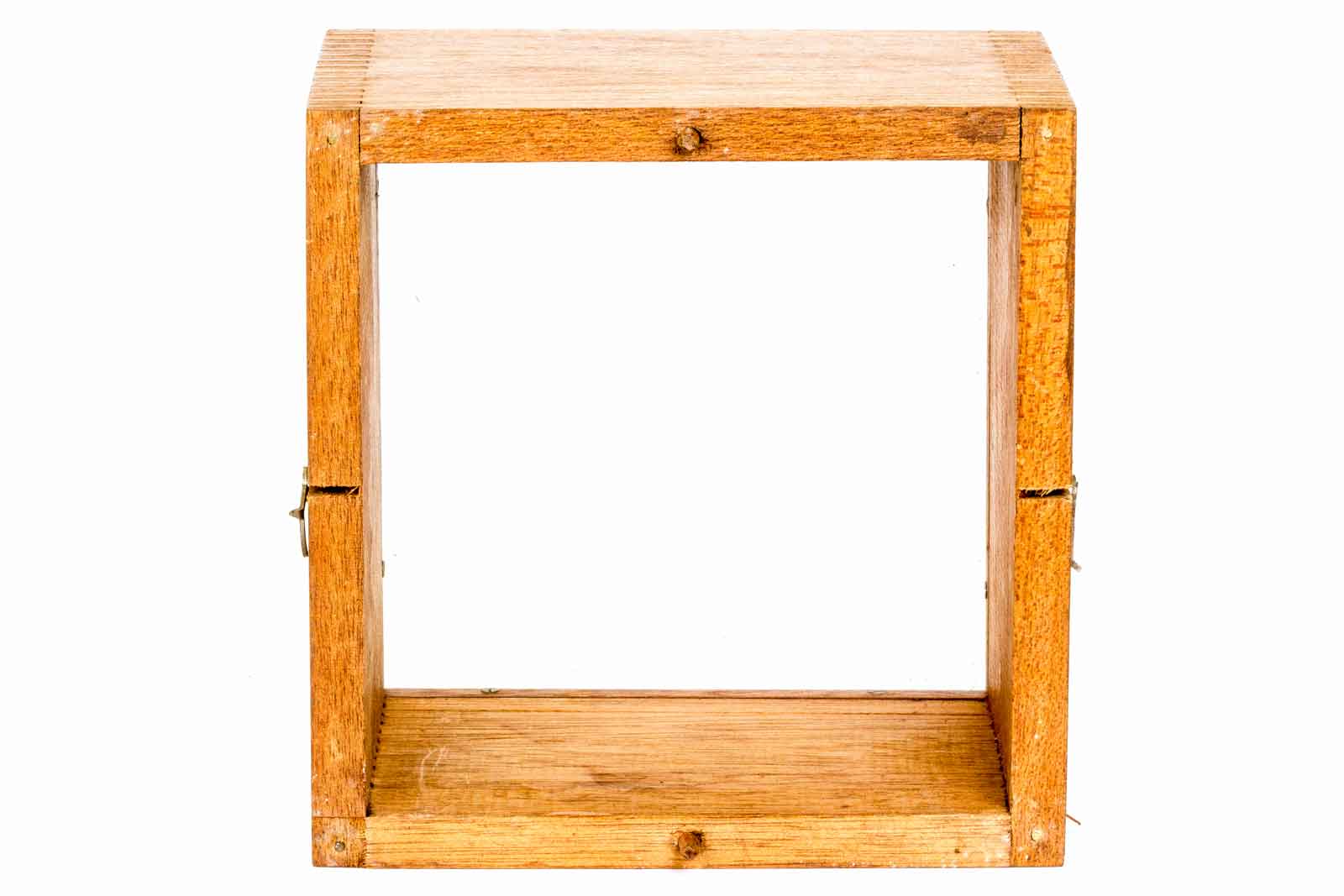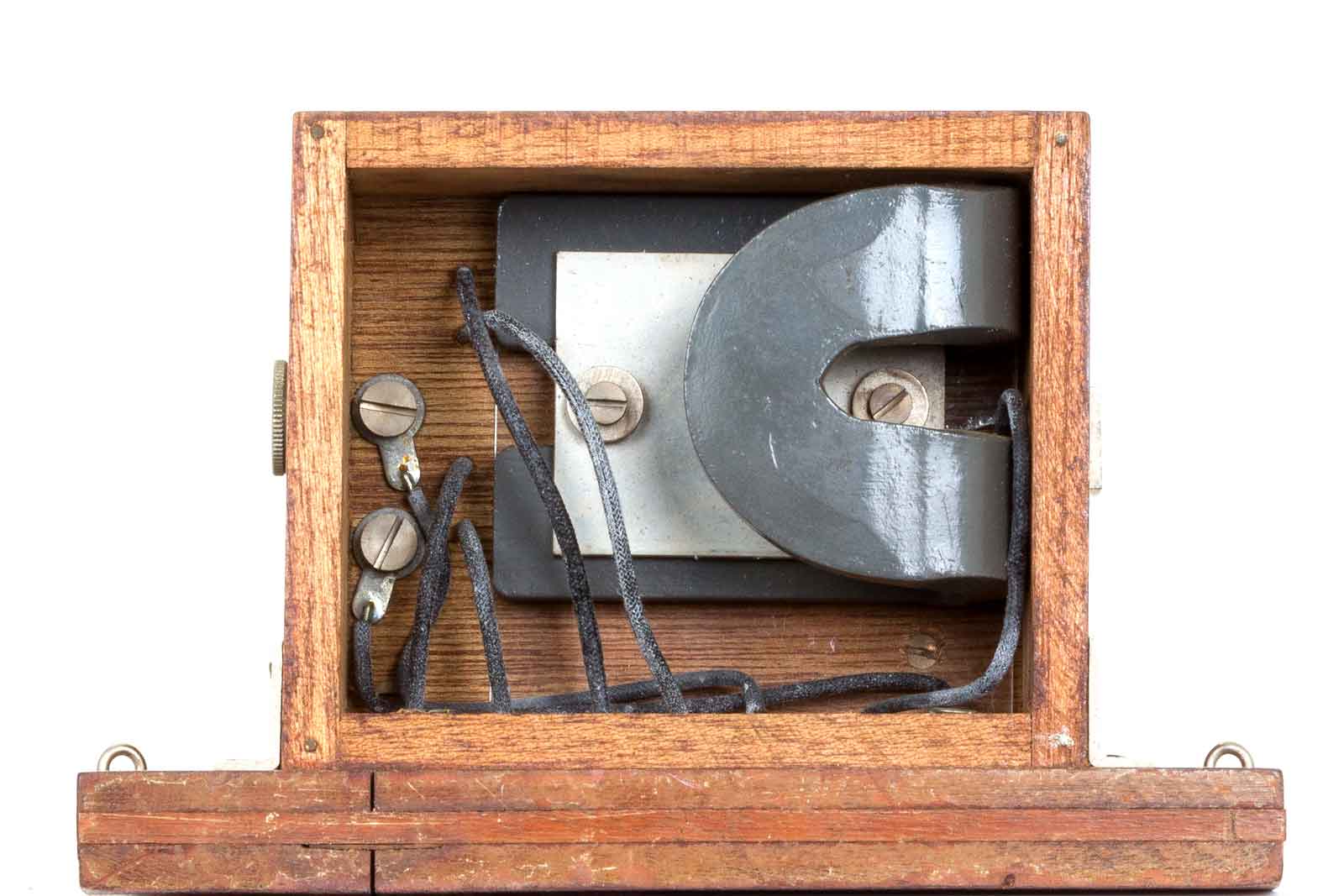 Het beschermende kastje. Aan de zijkanten haakjes om het binnenwerk vast te zetten. op het midden van de onder- en bovenkant twee paspennen om de zaak goed op z'n plaats te zetten.