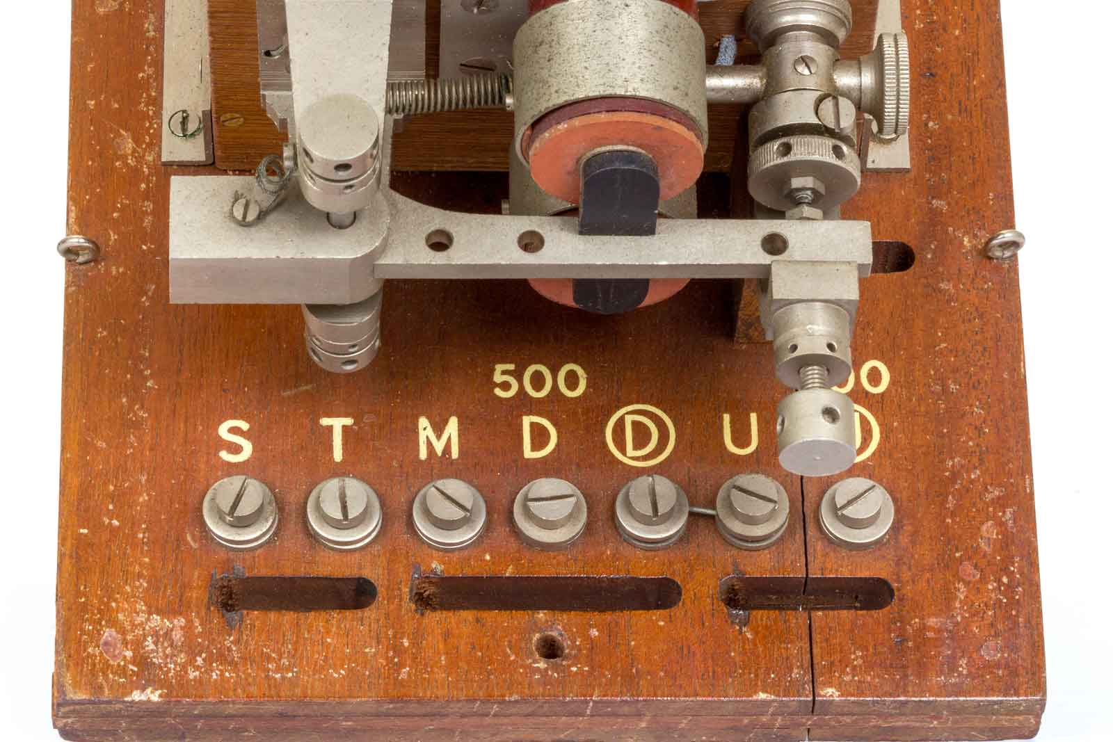 Het binnenwerk met de aansluitpunten De betekenis van de letters is nergens te vinden. De twee keer 500 zal wel betekenen dat hier aan de spoelen van 500 Ohm aan verbonden zijn. Misschien de D van Distance?? Maar de S, T en M ???, dat zijn de relaiscontacten, T is het moedercontact, S het verbreek- en M is het maakcontct.