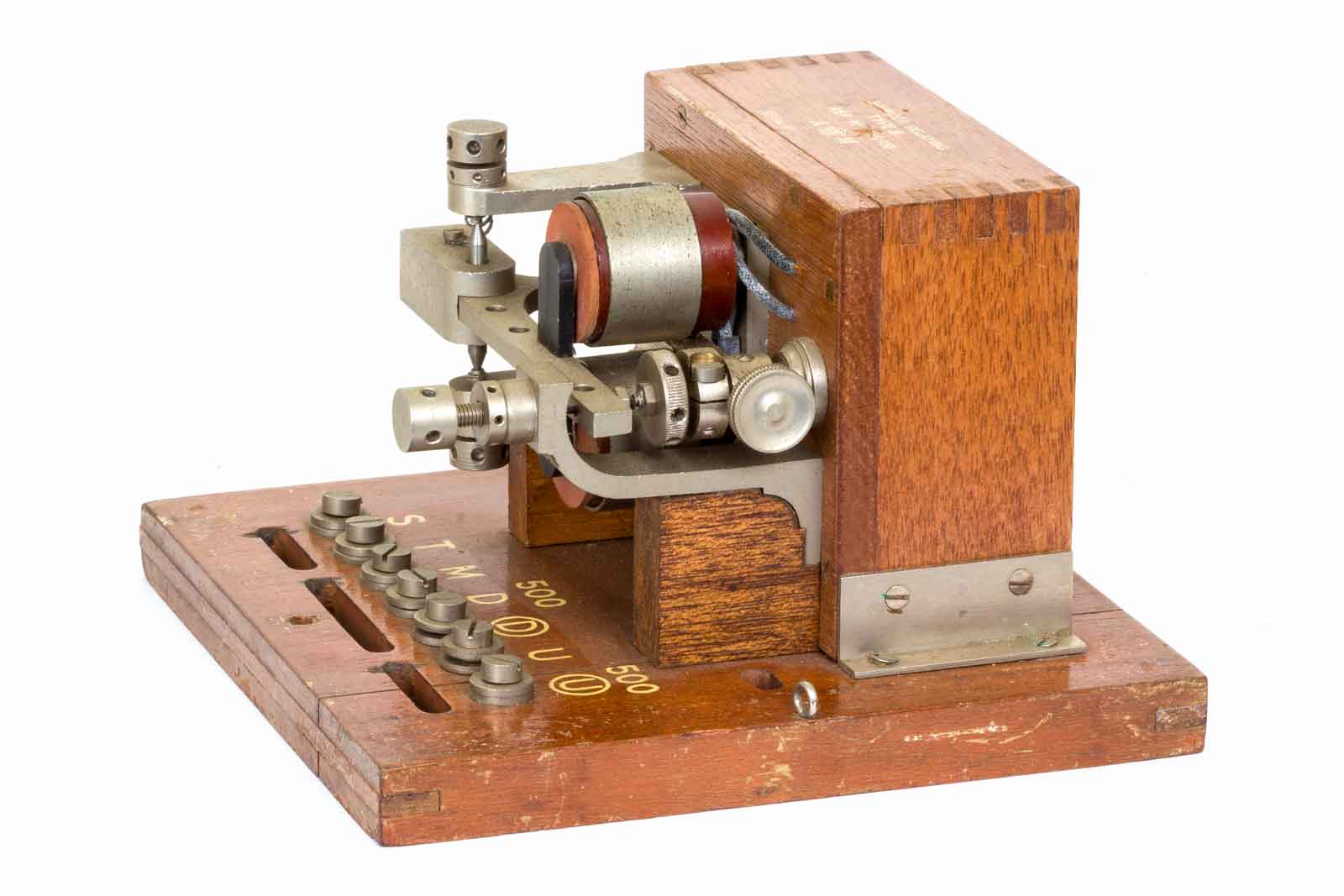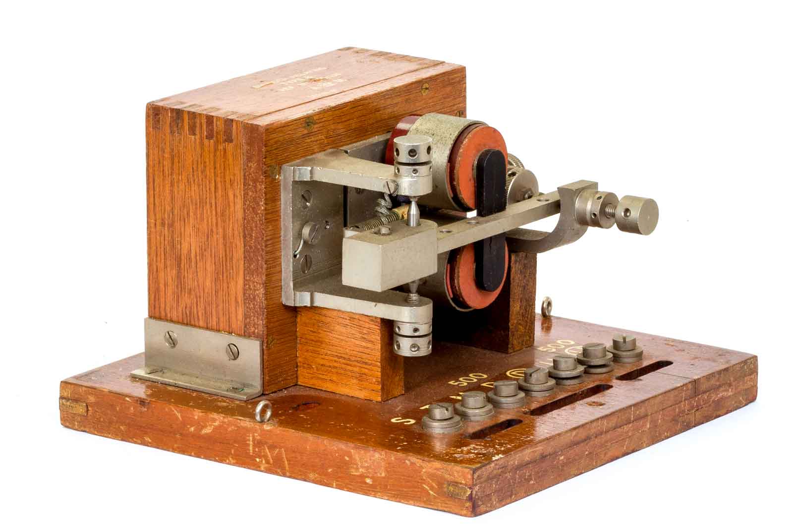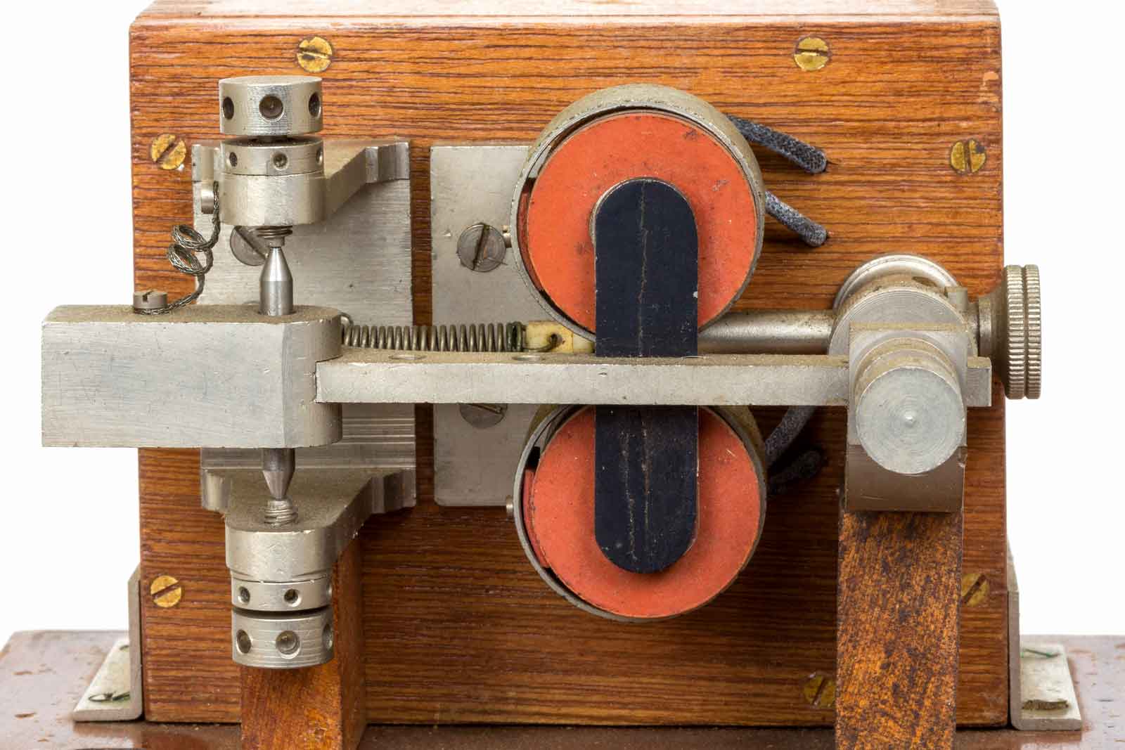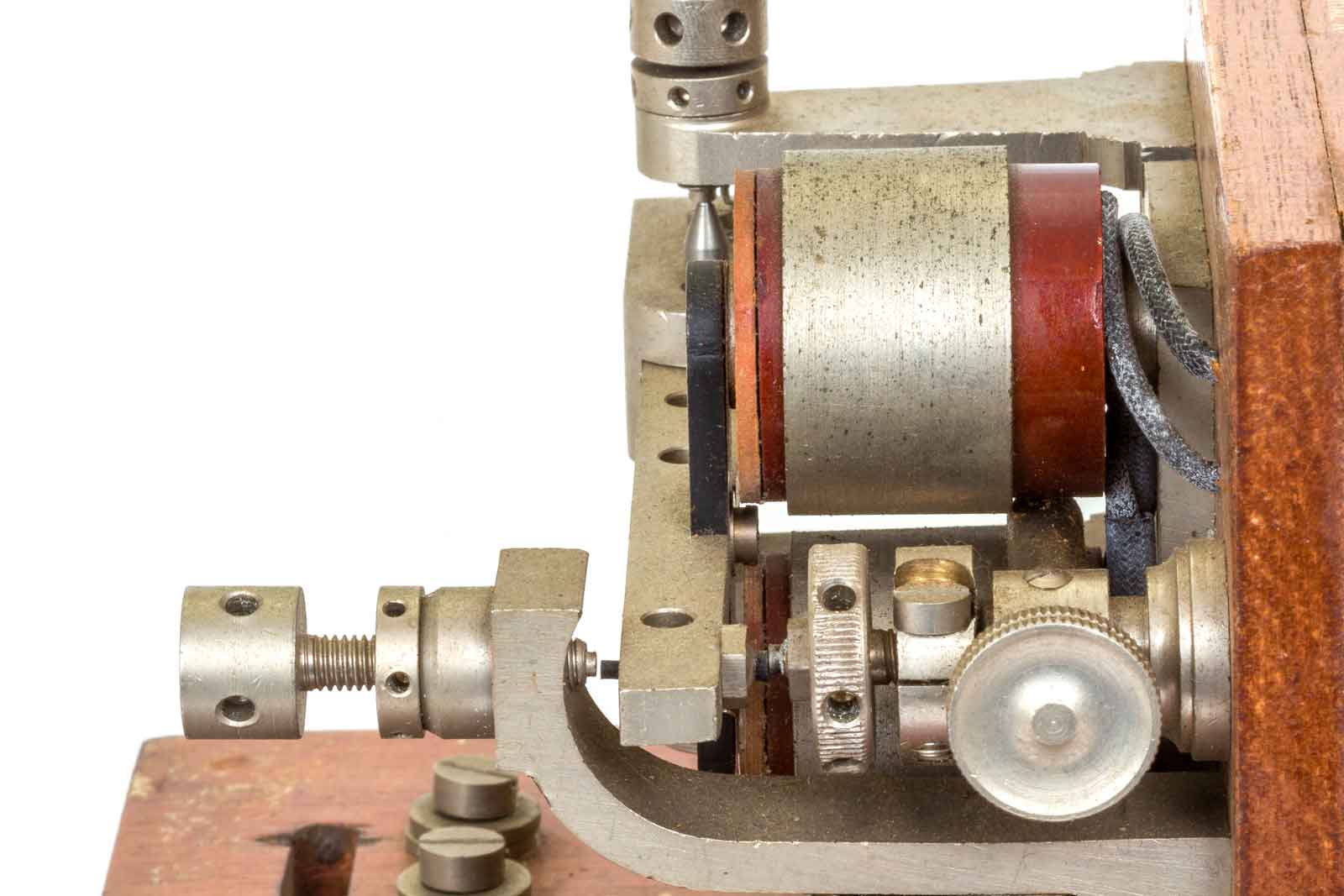 Het grote wiel rechts is voor de instelling van de veerspanning. Het geribde wiel dient voor het instellen van het rustcontact. Aan de linker kant de wieltjes voor de spleet van het maak-contact. Het ziet er allemaal erg degelijk uit.