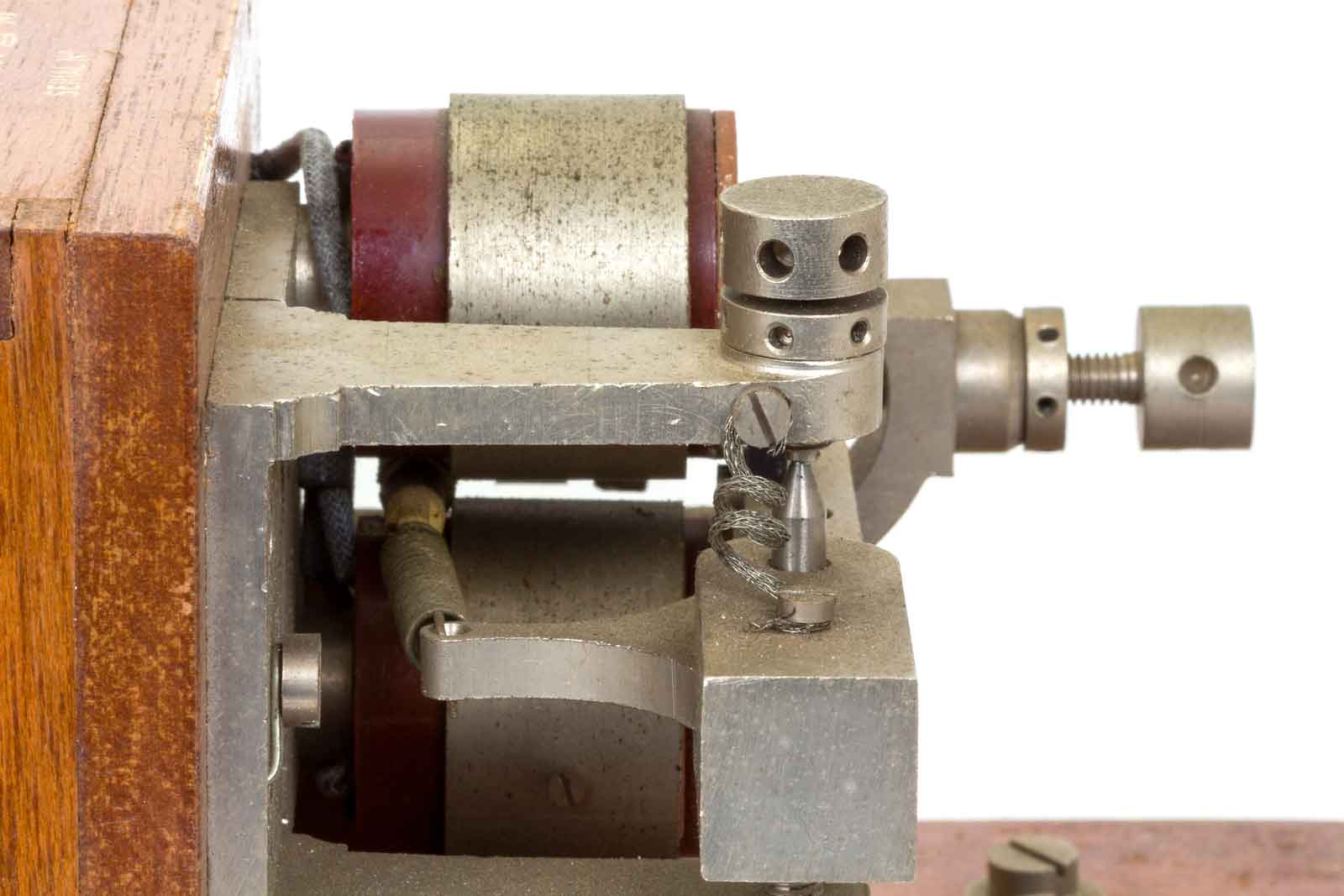 De linker kant met het scharnier van de arm. De lagering geschiedt met zogenaamde "taatsen", scherpe punten die in kommetjes vallen. Deze hebben de eigenschap bijzonder wrijvingsarm te zijn. Op het eind van de arm is een klein felxibel draadje te zien dat voor de verbinding van de arm naar de aansluitklem gebruikt wordt.