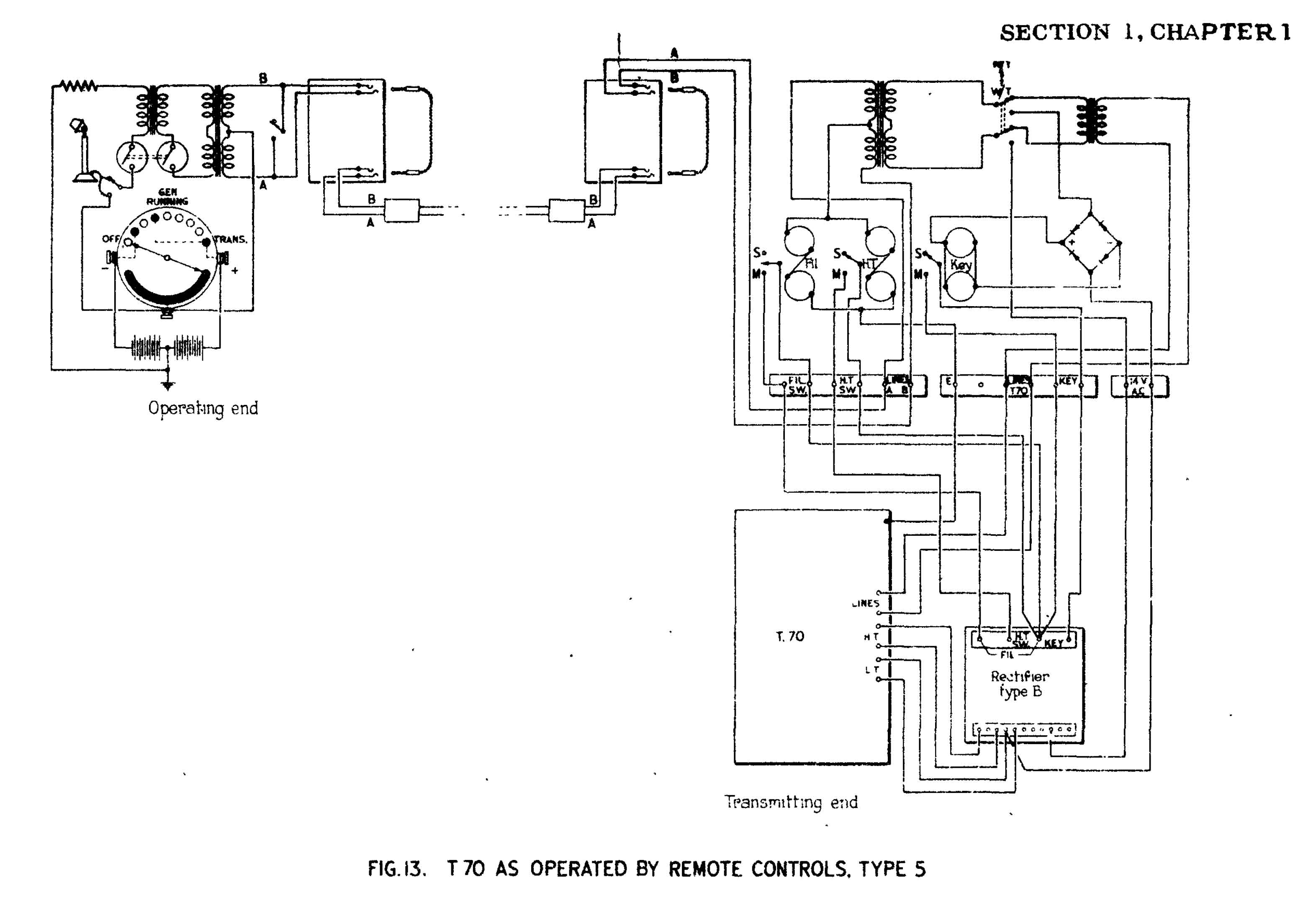 Hierbij wortdt dmv. een schakelaar in het "Operating end" ( links boven) een positieve of negatieve DC-spanning uit de twee,in serie geschakelde 12 Volt accus op de middenaftakking van de repeating coil gezet ( punt 4 en 7) . Deze spanning wordt via de lijnen A en B naar de repeating-coil van het remote-control panel op de punten 8 en 3 gezet en via de miiddenaftakking naar de betreffende Sounder-Relaying units gevoerd. De verbinding tussen de twee accus ligt aan aarde. Aan de andere kant wordt de aarde aan de bias-aansluiting gelegd. De twee Sounder-Relaying units voor de LT- en HT-inschakeling worden nu met een zuivere gelijkspanning met een positieve spanning geactiveerd en niet zoals bij de keying met een pulserende gelijkspanning. (De spoelen van de beide Sounder Relaying units staan parallel geschakeld).De schakel-contacten blijven gesloten totdat de operating-schakelaar weer op Off staat en een negatieve spanning op de relais-spoelen komt.. De relais werken in dit geval als gepolariseerde relais. Met een tweede schakelaar in het "Operating-end" wordt de koolmicrofoon van spanning voorzien en de secundaire van de microfoontrafo aan de primaire van de repeating coil gelegd en via de A- en B-lijn naar de coil in het Remote panel geleid en in de stand R/T vd. schakelaar aldaar naar de ingang van de modulator gevoerd. Met dit systeem worden dus drie functies op drie verschillende manieren van het Operating End naar het Remote-Panel gestuurd zonder elkaar in de weg te lopen. Hoe verzinnen ze het?