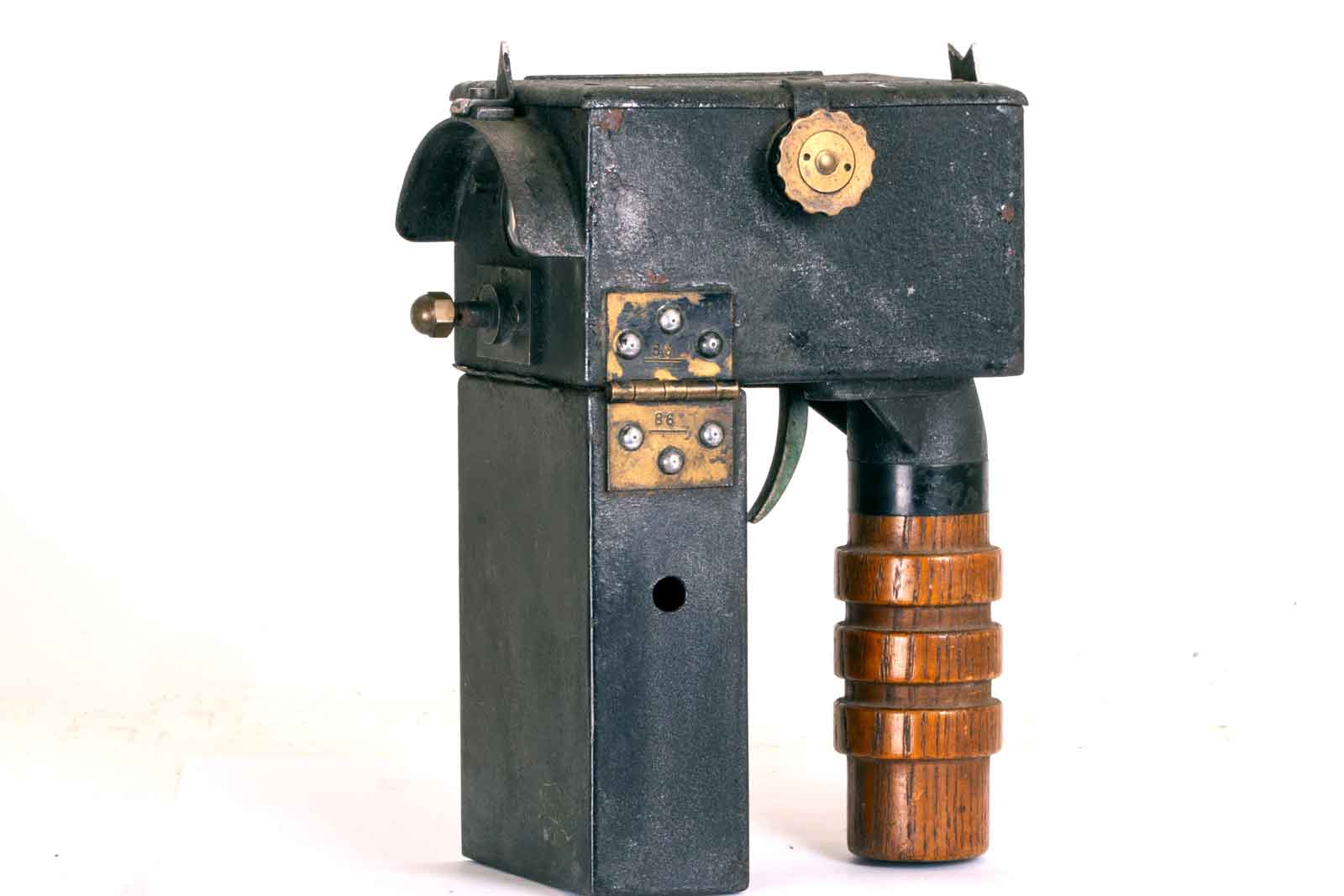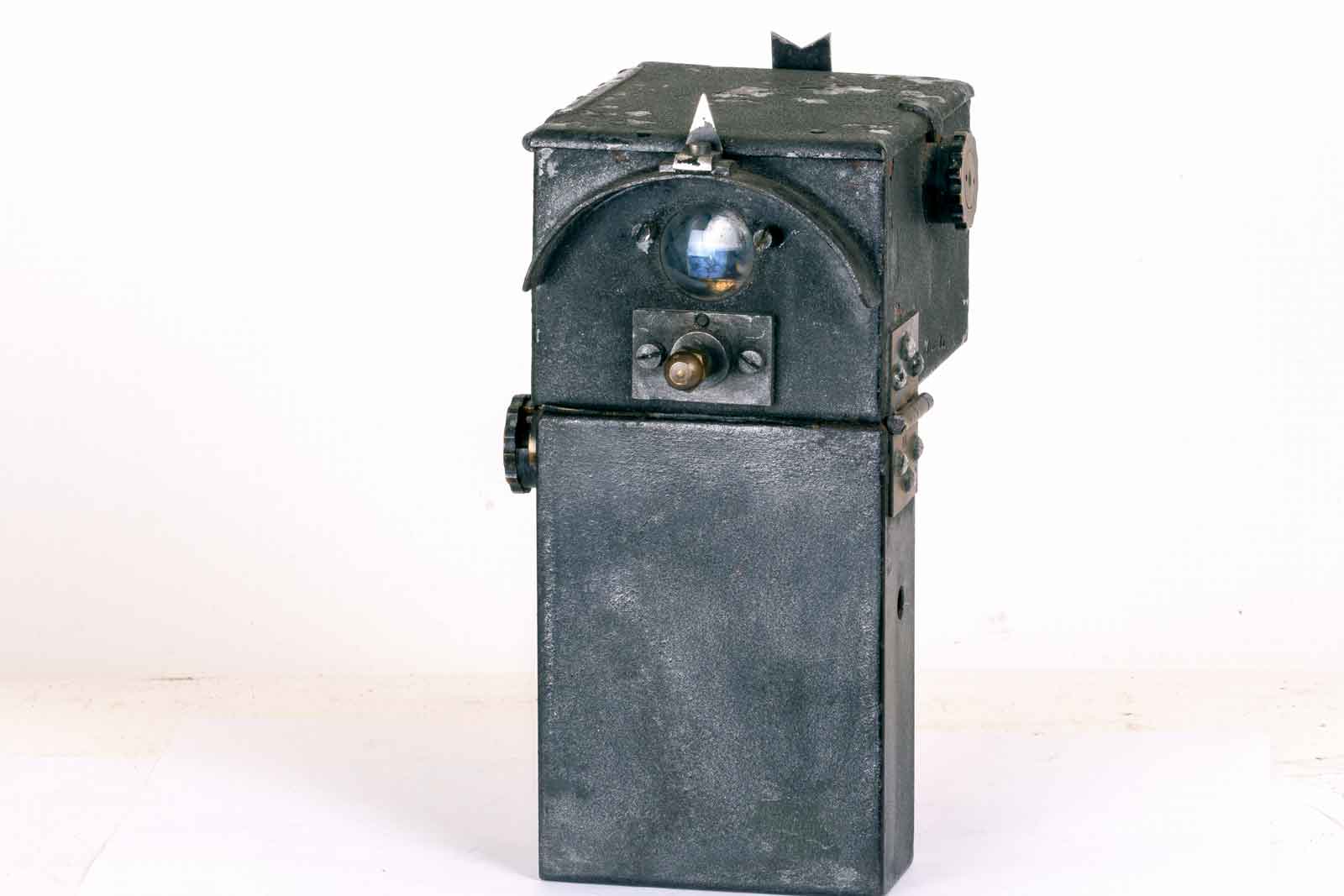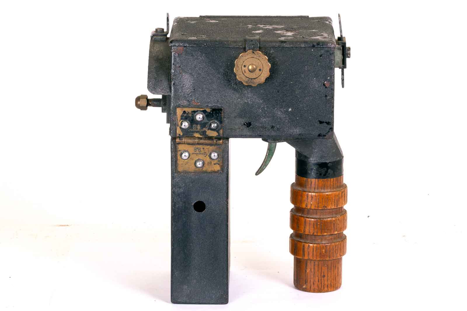 Dit is het apparaat, een seinlamp met een trekker van een geweer om te seinen.