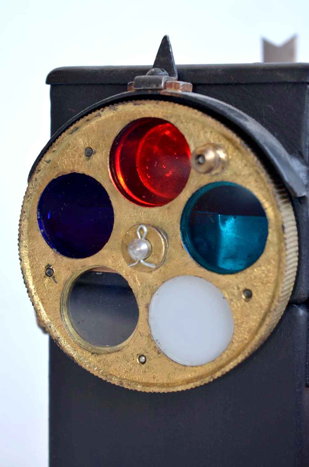 Oranje/Amber: Deze kleur diende vaak als herkenningssignaal (identification). Het hielp schepen om elkaar te identificeren als behorend tot hetzelfde konvooi zonder de felheid van wit licht te gebruiken. Een oranje filter was trouwens niet aanwezig op deze lamp.