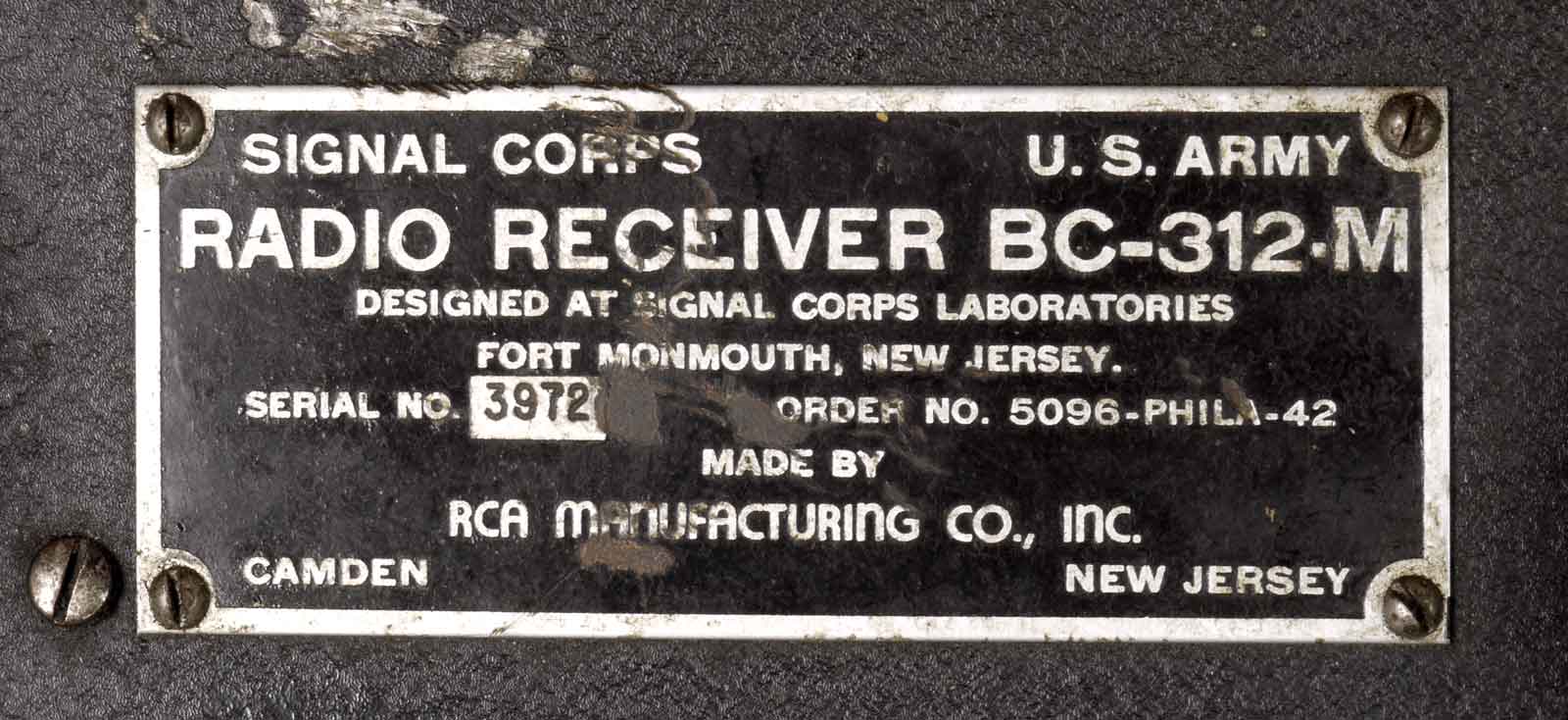 Het type-plaatje, dit exemplaar is in 1942 gemaakt door RCA. Het is een BC-312-M. Voor de preciese beduiding van de suffix verwijs ik U naar TM-11-850.