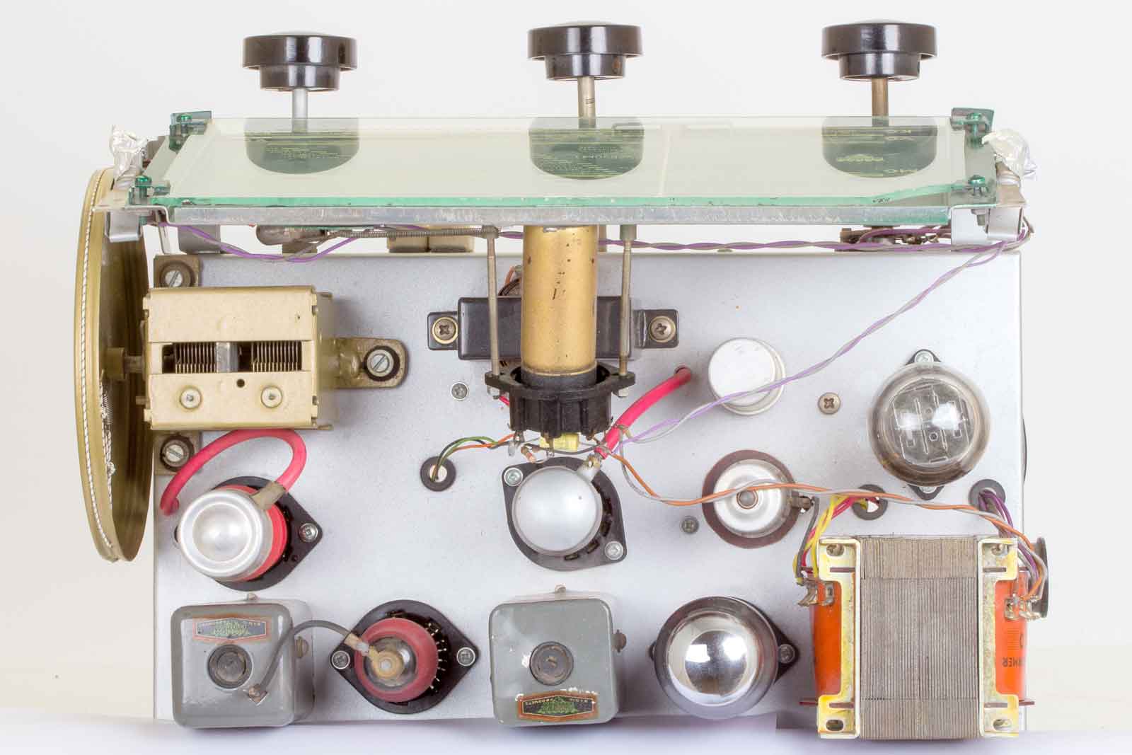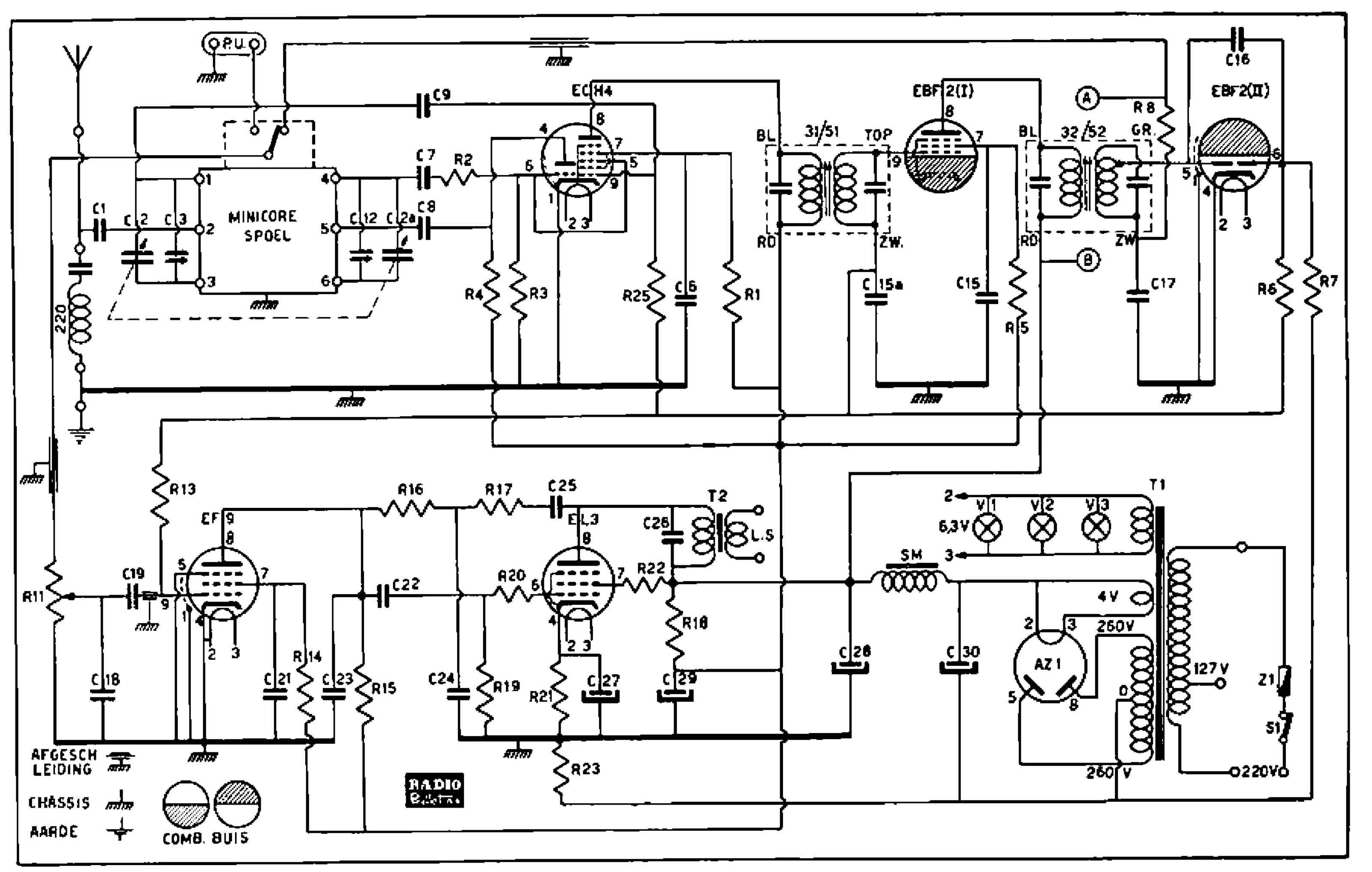 Bovenaanzicht, onder de dubbele afstem-C de mengbuis, een ECH3, daar onder de 1. MF-trafo, met rechts daarvan de MF versterker EBF2 met de detector-diodes. Boven de tweede MF-trafo (midden) een EF9 die als LF-versterker ingezet is. En daar boven de EM4. Rechts naast de 2. MF, de EL3N met daar naast de trafo met daar boven de AZ1.