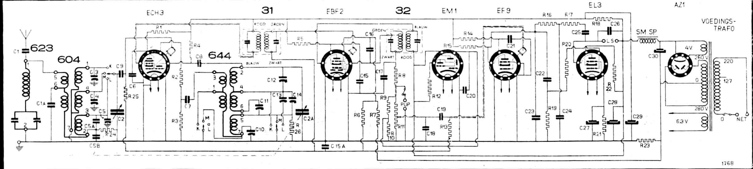 Op deze foto zijn de twee spoelen 644 en 623 te zien. Het type 623 is een zogenaamd fluitfilter dat MF-signaaltjes van 471 kHz onderdrukt.