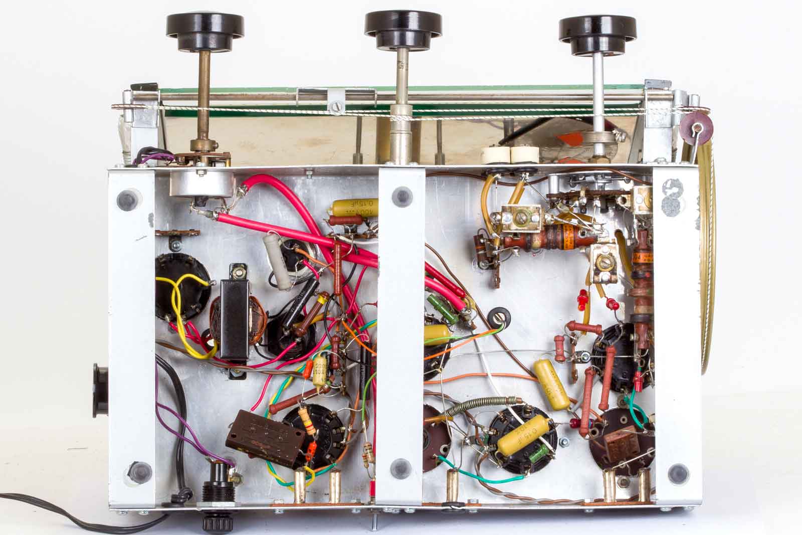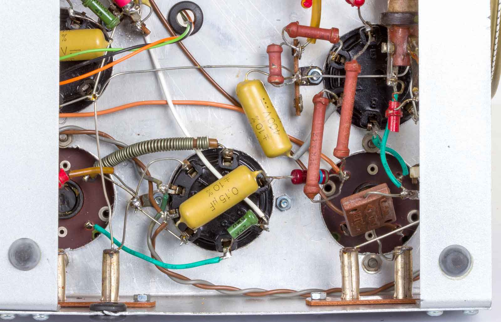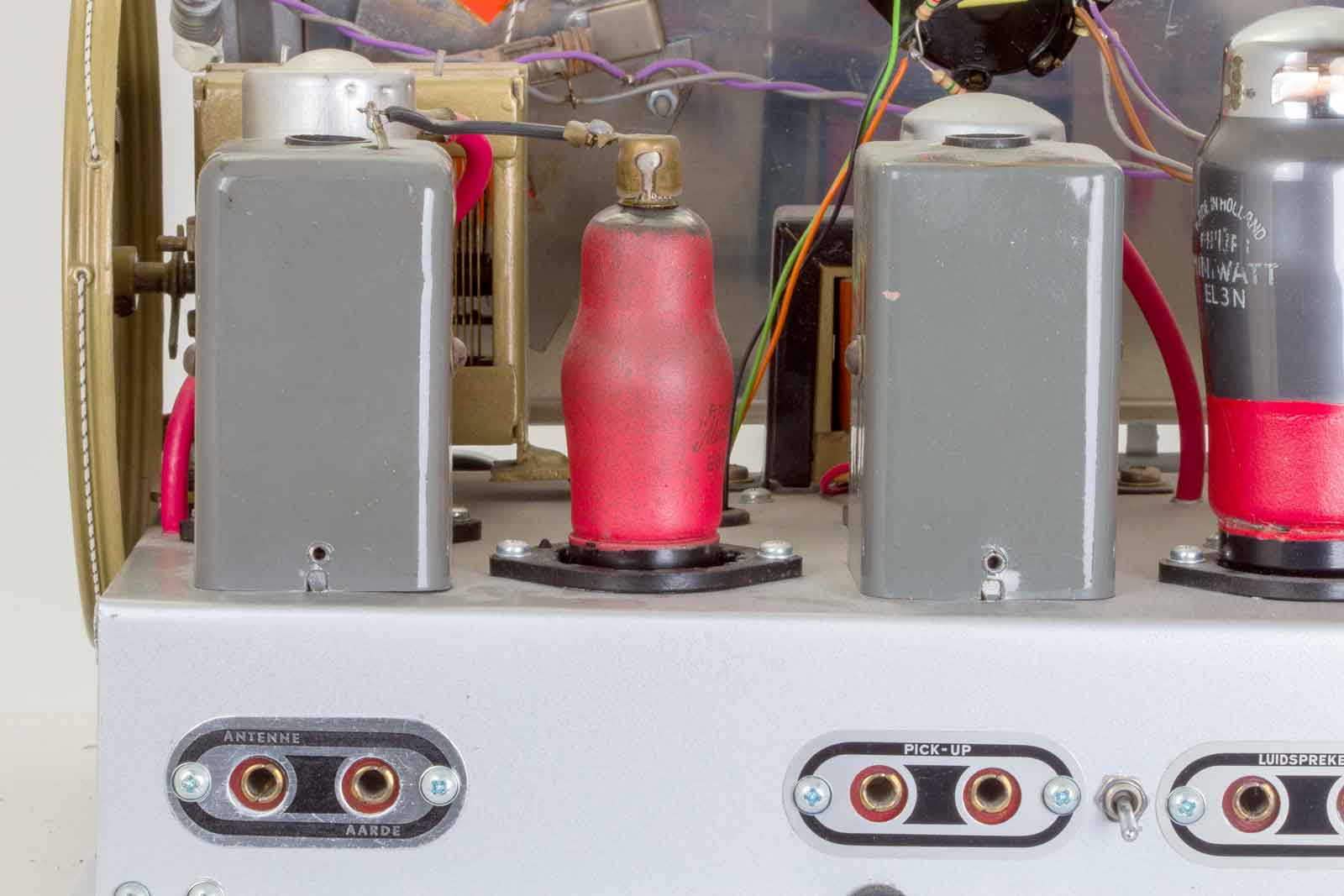 Gelukkig zijn alle slechte papiercondensatoren al vervangen door de uitstekende "mosterd"-types van Philips. De bruinige weerstanden komen ook uit Eindhoven.