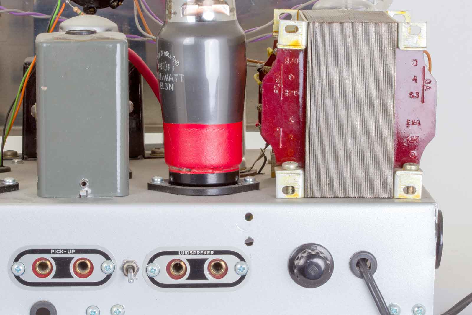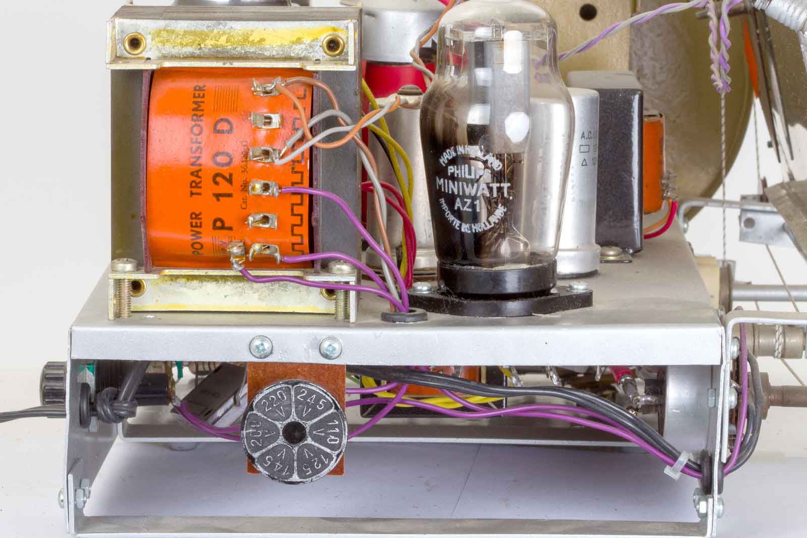 Op bovenstaande foto is dat beter te zien. De trafo wordt geflankeerd door de zeer bekende AZ1 gelijkrichter. Er is zelfs een echt spannings-caroussel aanwezig!