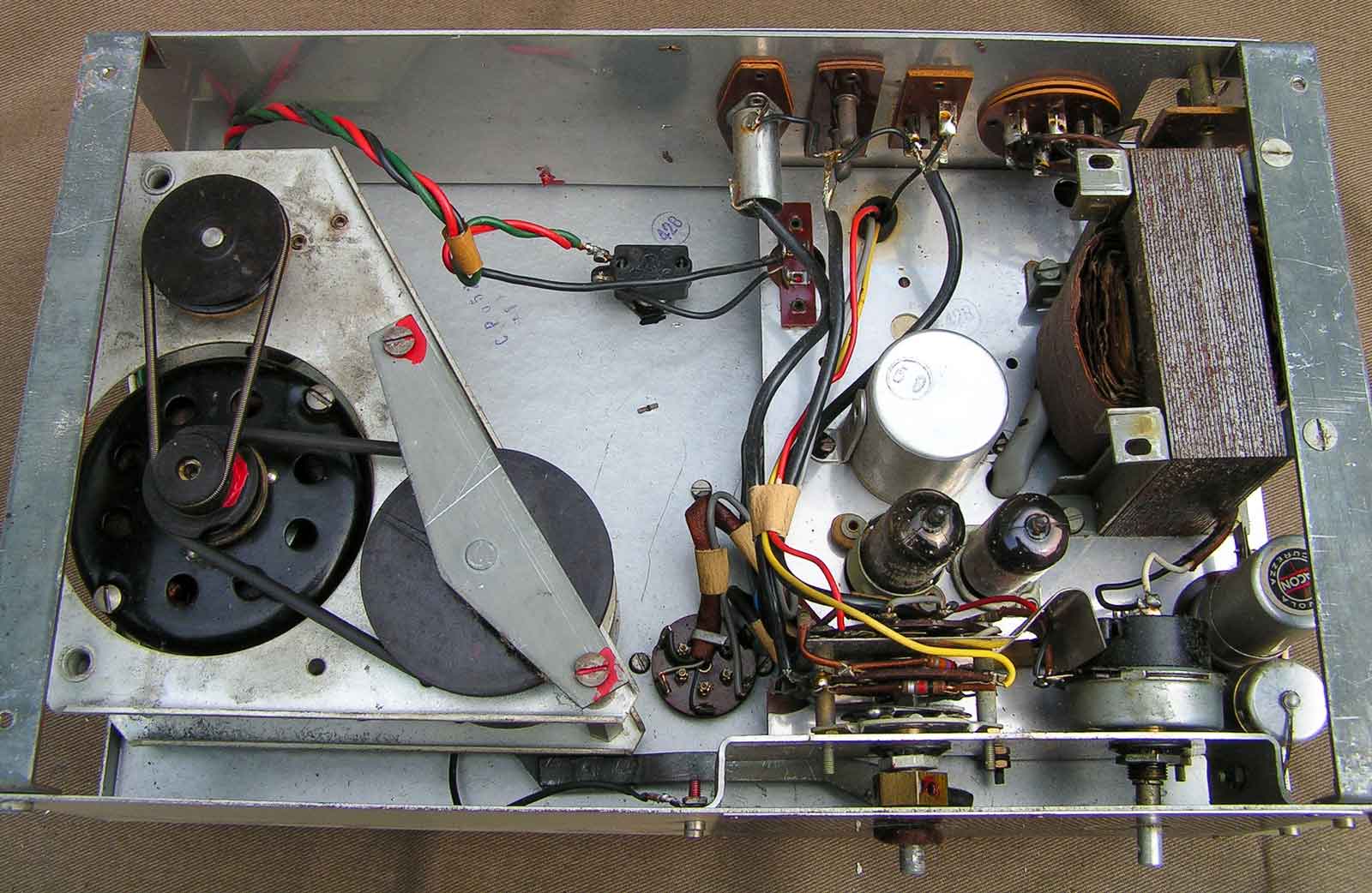 De onderzijde met de aandrijfmotor. Een snaar naar de aandijfas (capstan?) en een naar de opwindkant van de spoelen.