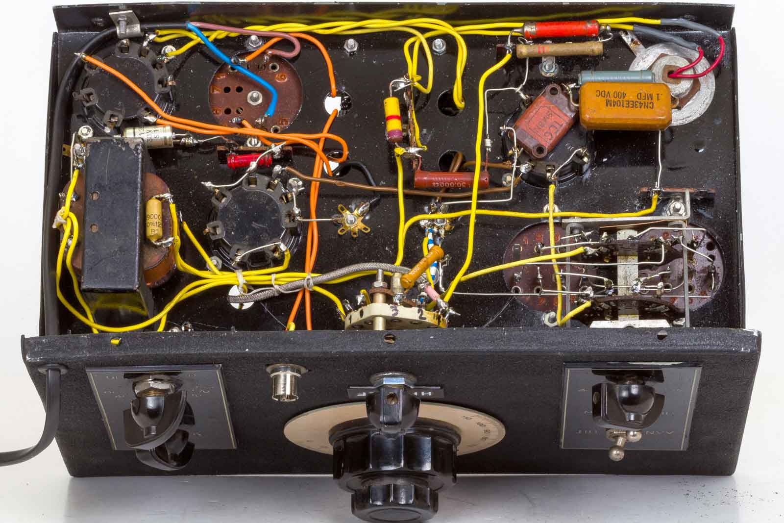 Een wat betere blik op de componenten en de bedrading. Bijna volgens het voorbeeld uit het boekje. Der oude componenten zijn weer gebruit, behalve de frequentiebepalende condensator op de modulatie-trafo. Dat is een Philips mosterd-kleur geworden. De bedrading is niet zo mooi geworden als op de bouwtekening, maar het werkt weer.