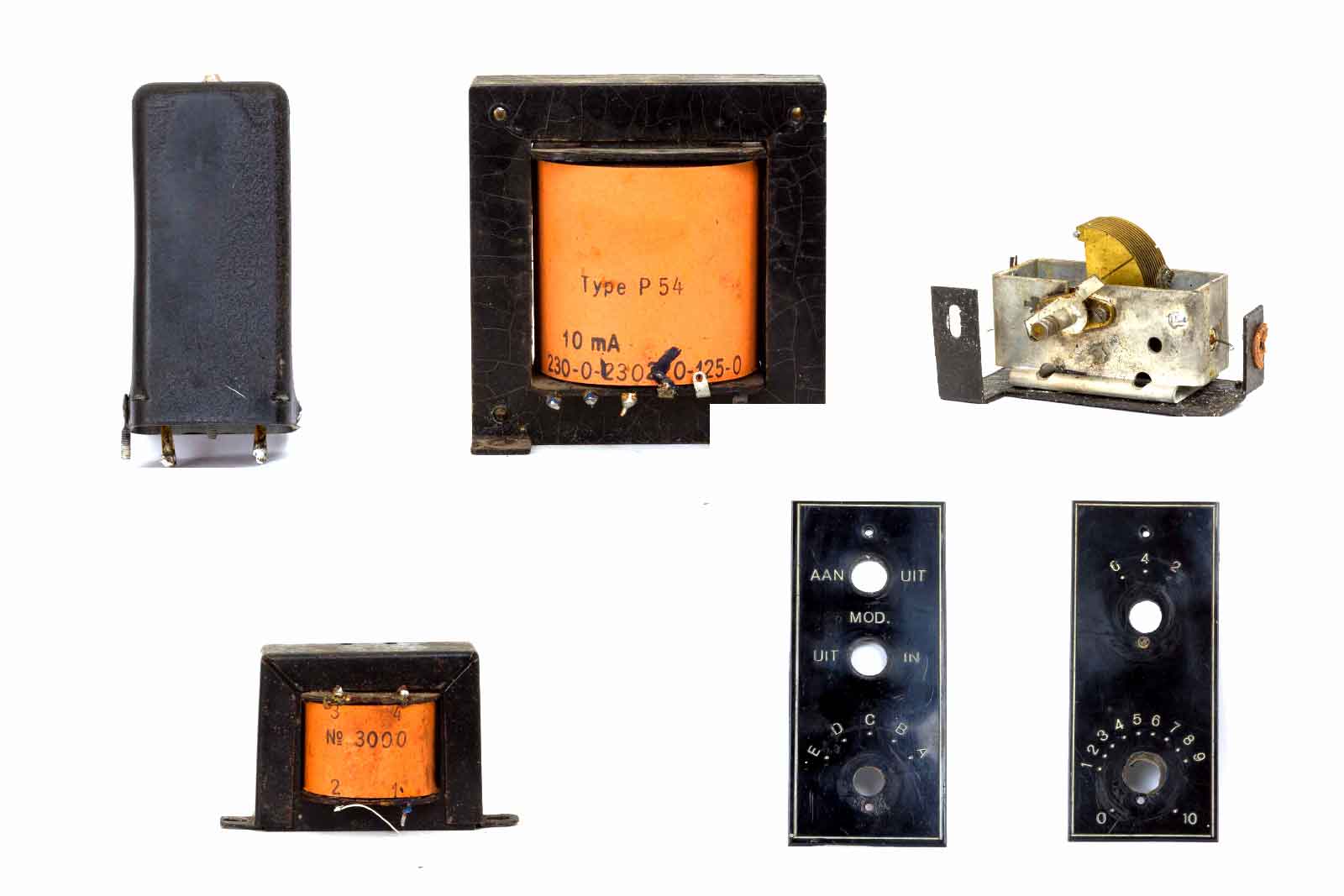 Enige andere onderdelen, links boven het net-filter, de Type P54 voedingstrafo, de afstem-C, de modulatie-trafo type 3000 en twee tekst-bordjes.
