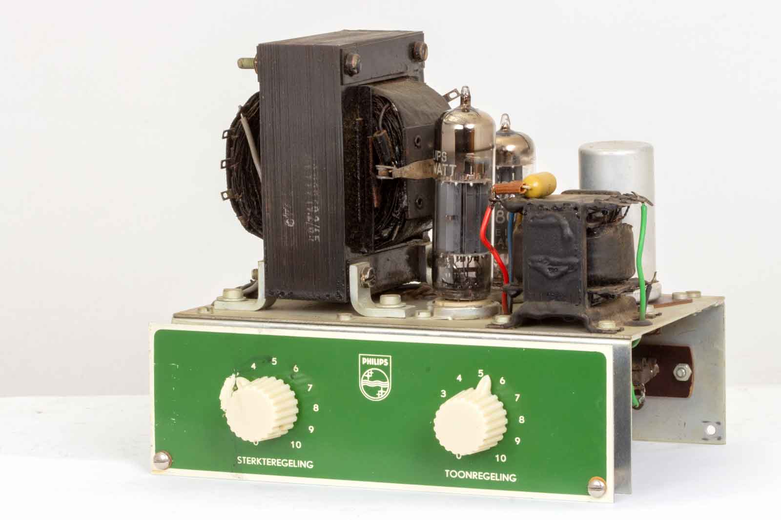 Het front met de beide regelaars. Boven op links de voedingstransformator met daar naast de ECL82 en de uitgangstransformator.