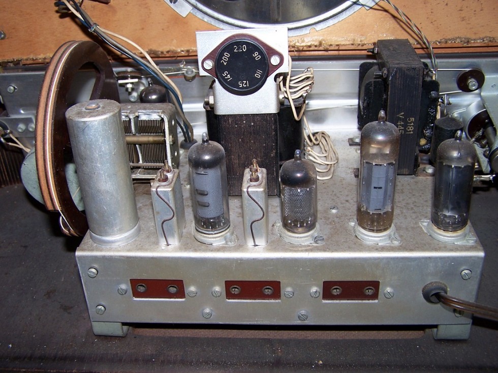 Een blik op de buizen, vlnr. ECH81, EBF80, EF86, EL 84 en AZ80. De afstem-inicator, EM80 is op deze foto niet te zien.