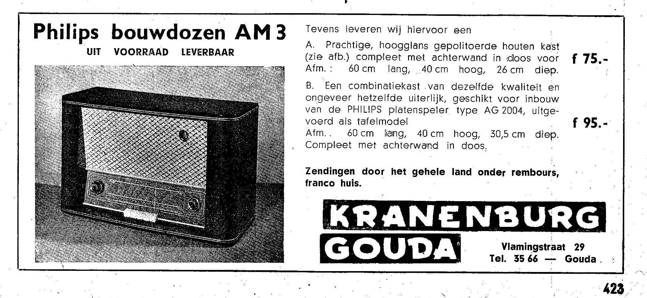 Een oproep om wat meer te weten te komen over de AM 3 op het "Nederlands Forum over Oude Radio's" leverde waardevolle informatie op, Adri van Dam stuurde een aantal foto's van het toestel plus een advertentie van de firma Kranenburg, die voor de AM 3 een speciale kast aanbood.