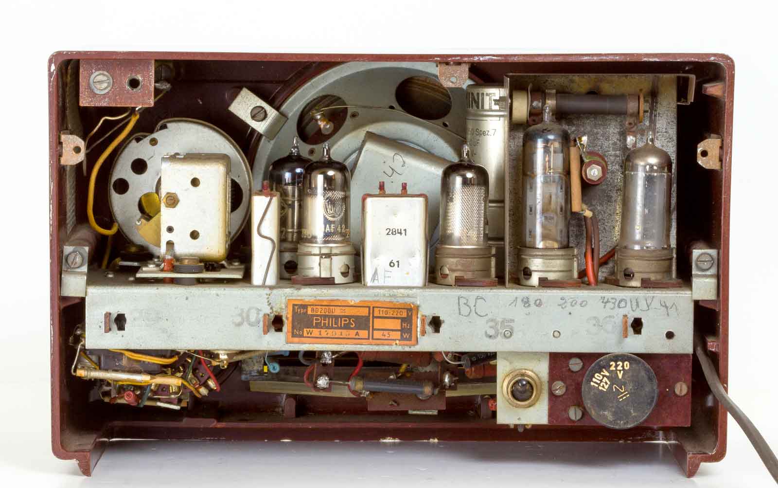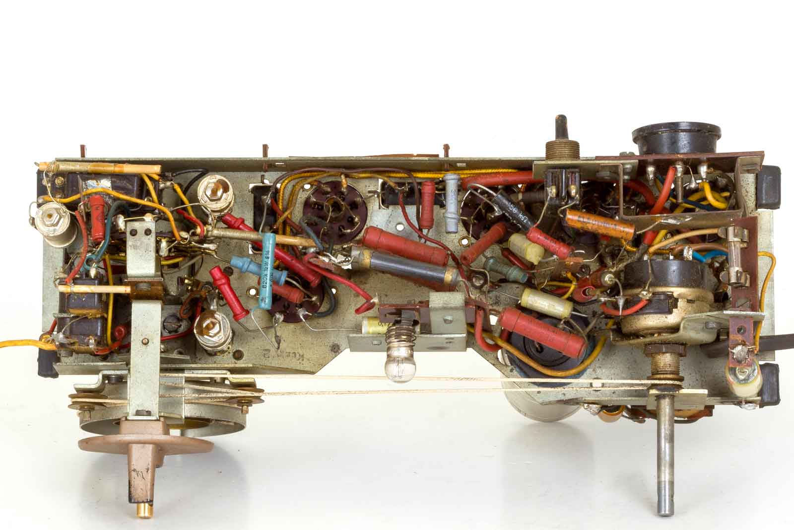 De gelijkrichter en de UL41 zonder zoeknok. De dikke weerstanden waren al eens vervangen en bungelden gewoon los in de ruimte. De zwarte weerstand bovenin is de serie weerstand van het gloeidraad circuit. Dat zijn nogal behoorlijke warmtebronnen en slobberen ongeveer de helft van de totaal opgenomen 45 Watt van het toestel op. Sommige restaurateurs gooien ze er uit en vervangen ze door een passende condensator. Die geeft duidelijk minder warmte. Met wat kunstjes kan het gloeistroomcircuit beduidend eenvoudiger gemaakt worden. Vooral het vervangen van de schaalverlichtingslamp door een weerstand van 190 Ohm en de daar over vallende 19 Volt gebruiken voor de voeding van een paar LED's voor de verlichting is niet zo'n slecht idee. Vergeet niet dat bij het defect raken van dit gloeilampje de hele ontvanger niet meer werkt. Verder kun je in Nederland de omschakeling naar 110/127 Volt wel weg halen. Maar ja, het is niet meer origineel, maar dat is na het vervangen van diverse teerknollen en hoogohmige weerstanden toch al niet meer het geval.