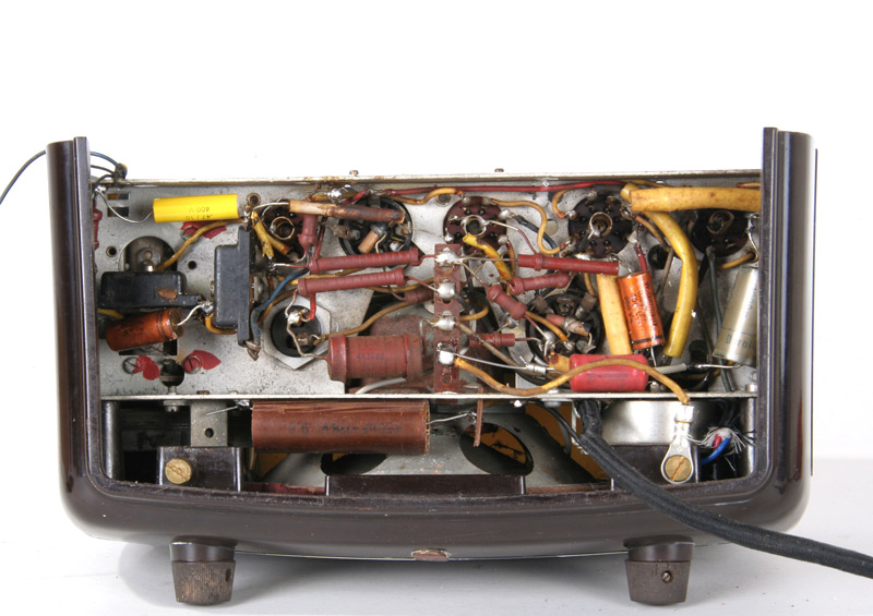 De gesloten achterkant. Dat moet ook wel want het chassis ligt direct aan het lichtnet. Het is trouwens niet de originele achterkant