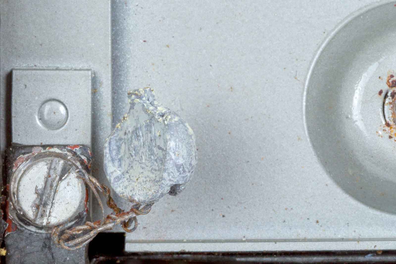 Oeiiiiii, wat zien we daar??? Een verzegelde schroef. De inhoud van het toestel was zo geheim dat een verzegeling aangebracht was. Wanneer het zegel verbroken was werd de garantie waarschijnlijk direct beeindigd en de eigenaar levenslang oppgesloten.